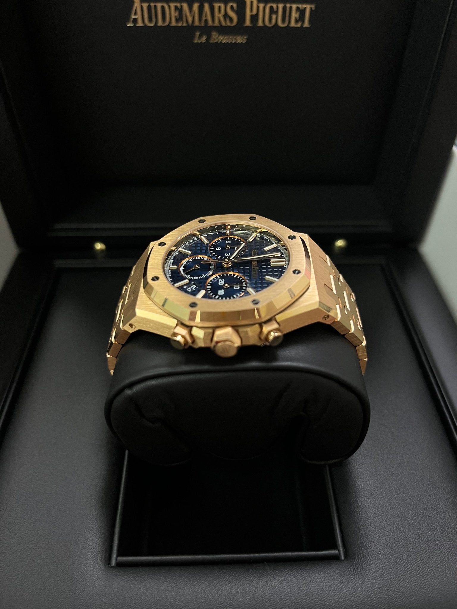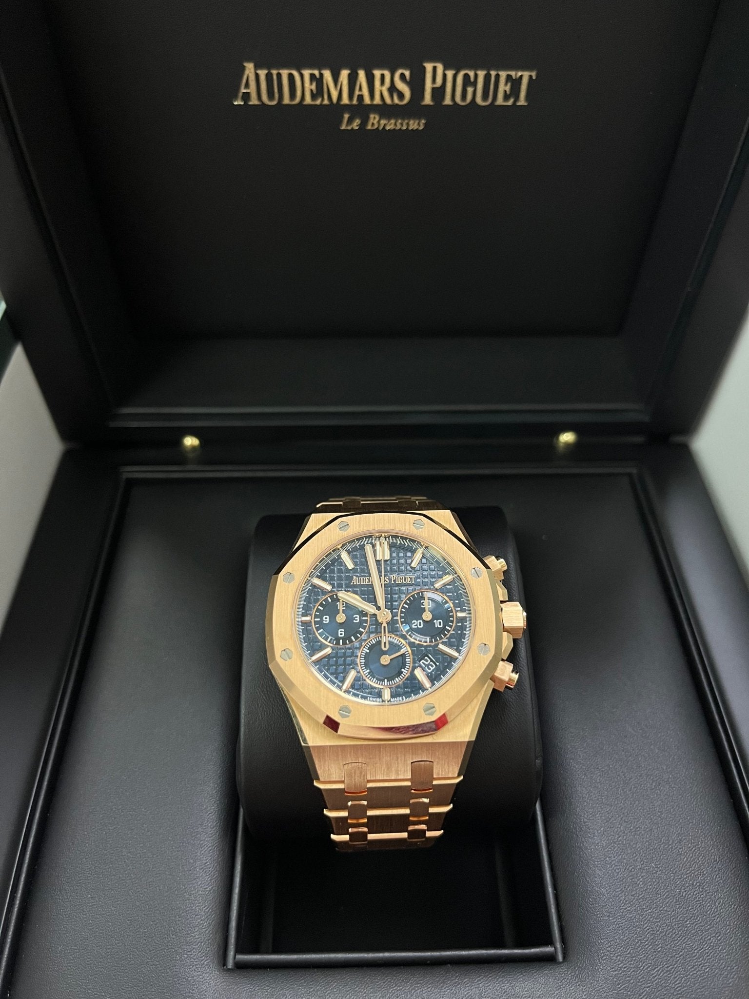 This 38 mm Chronograph is endowed with the new Royal Oak design evolution. The pink gold case and bracelet are contrasted with a “Grande Tapisserie” dial adorning the iconic Bleu Nuit, Nuage 50 hue. “Bleu nuit nuage 50” dial with “Grande Tapisserie” pattern, “Bleu nuit nuage 50” counters, pink gold applied hour-markers and Royal Oak hands with luminescent coating.