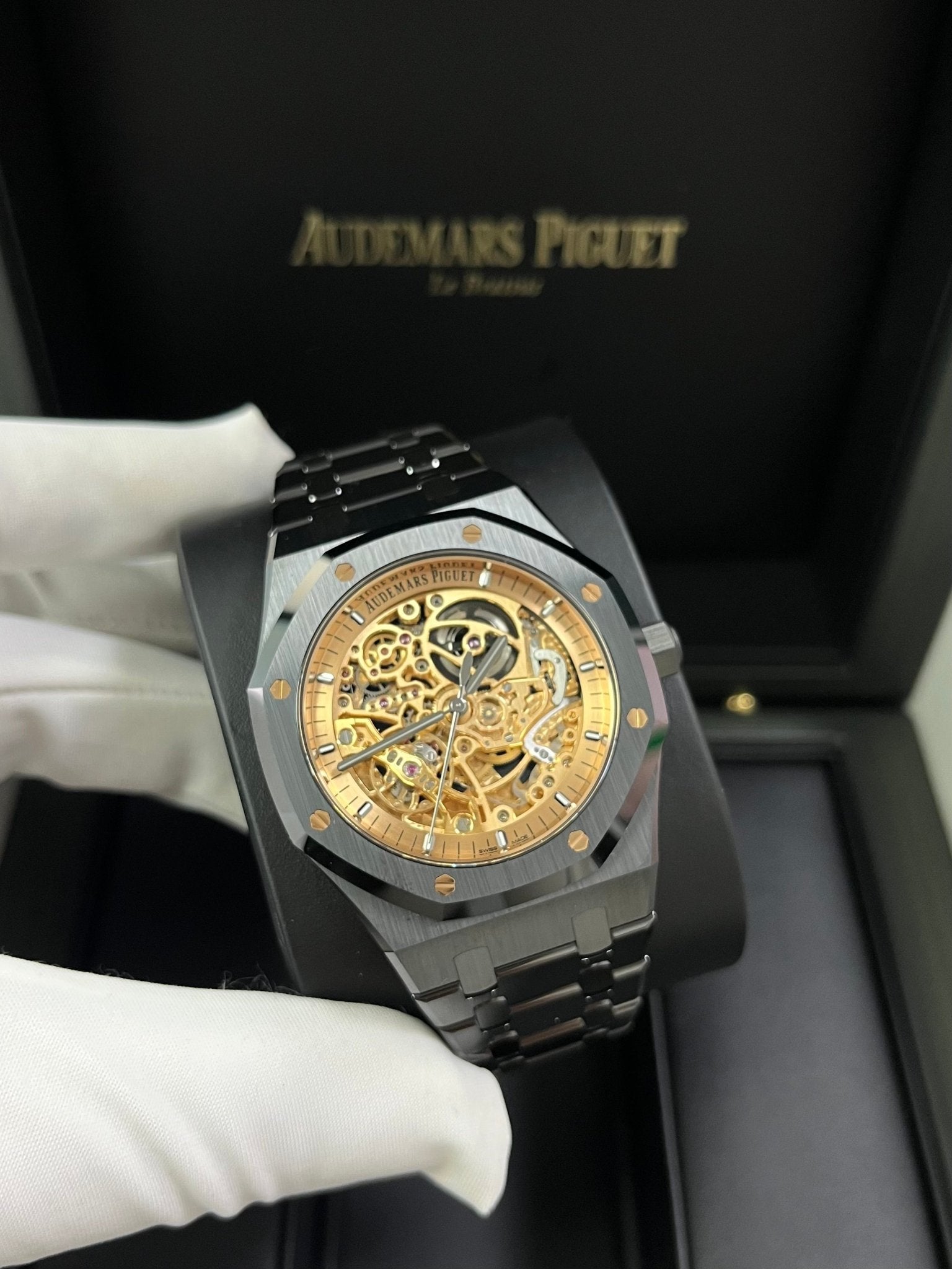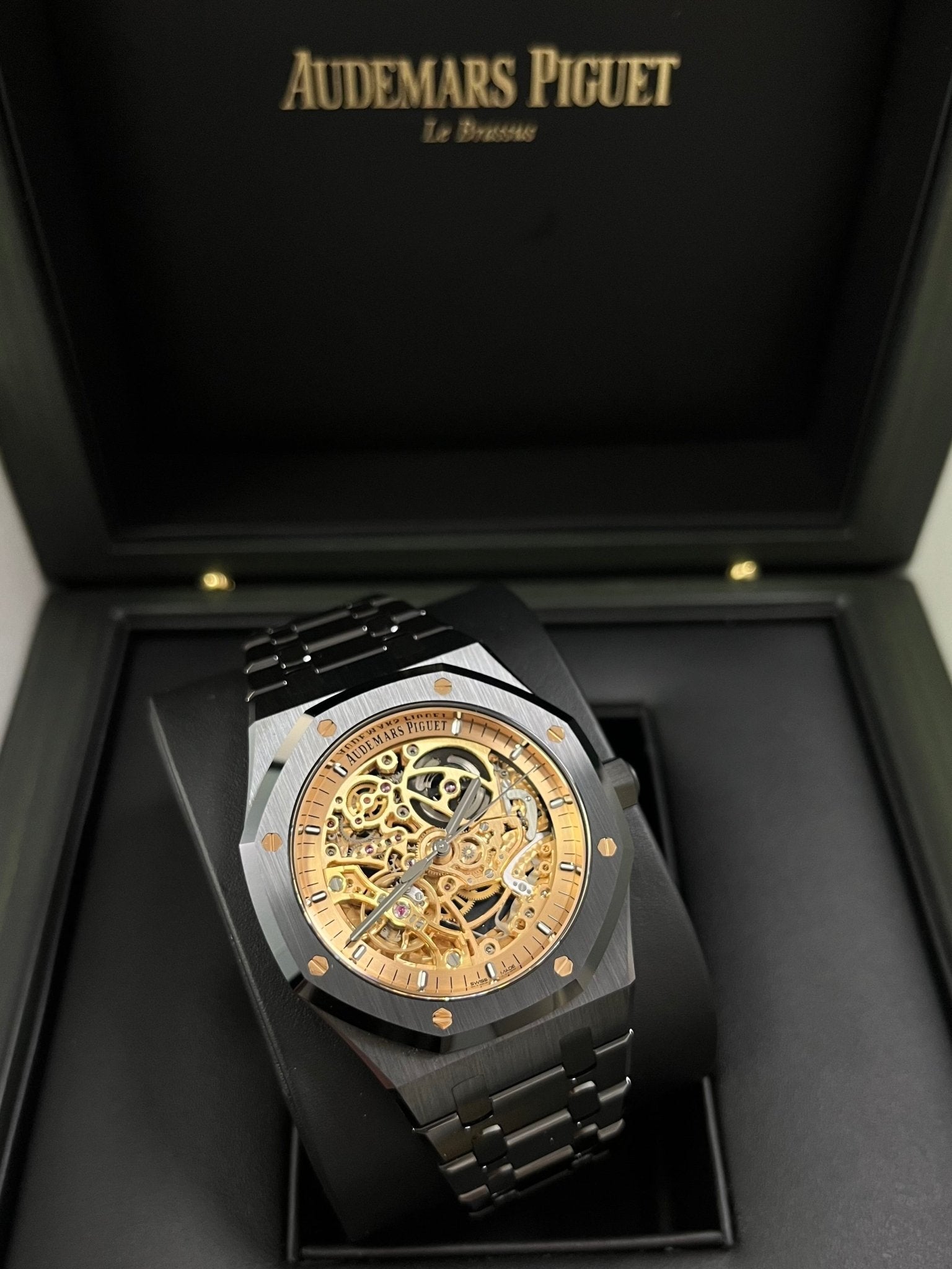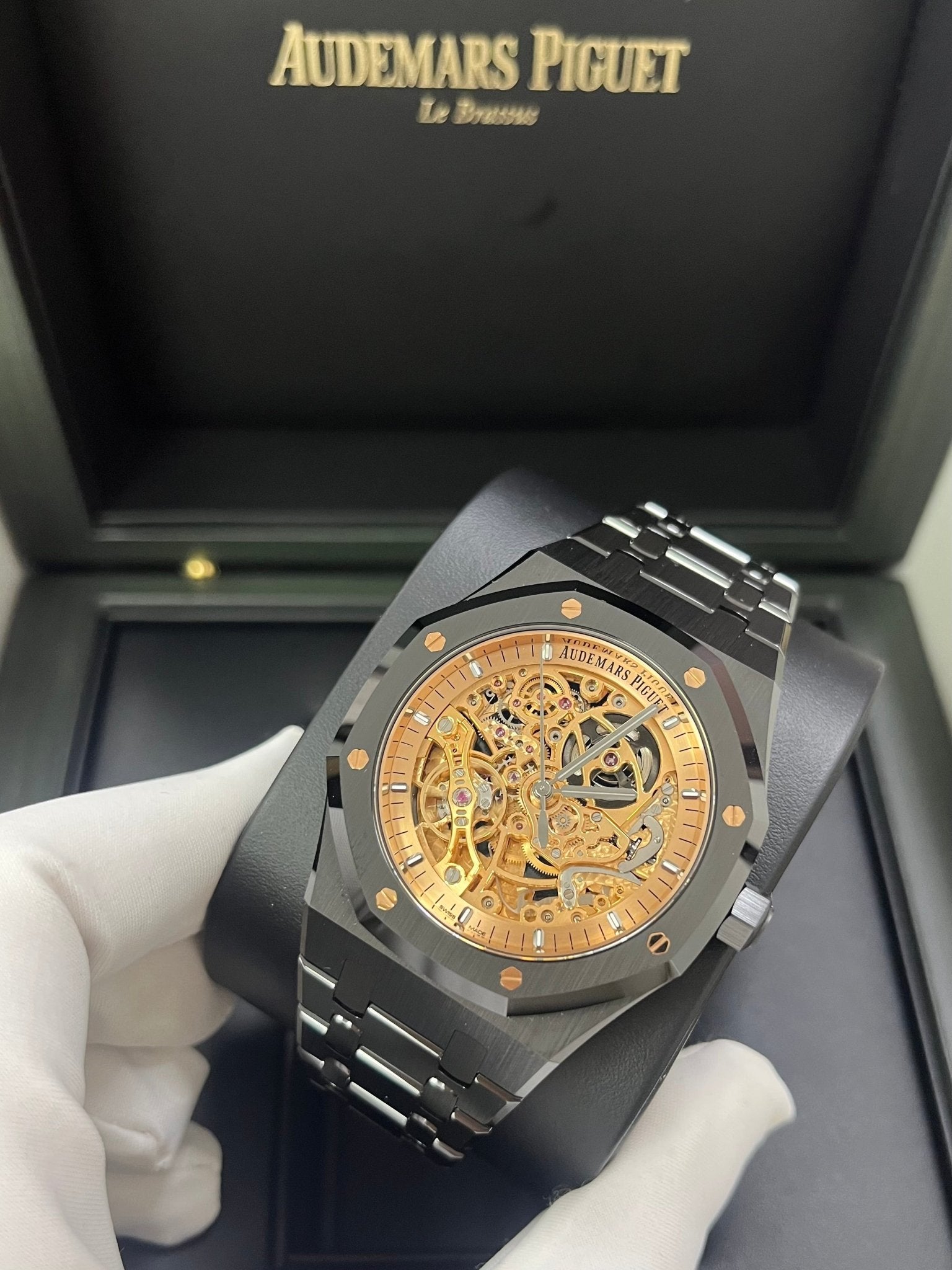 This limited edition of 150 pieces combines black ceramic with a pink-gold-toned openworked movement and matching inner bezel. Black rhodium-toned hands and hour-markers add contrast. Black ceramic case, glareproofed sapphire crystal and caseback. Pink gold-toned inner bezel, blackened rhodium applied hour-markers and Royal Oak hands with luminescent coating. Black ceramic bracelet with AP folding clasp.