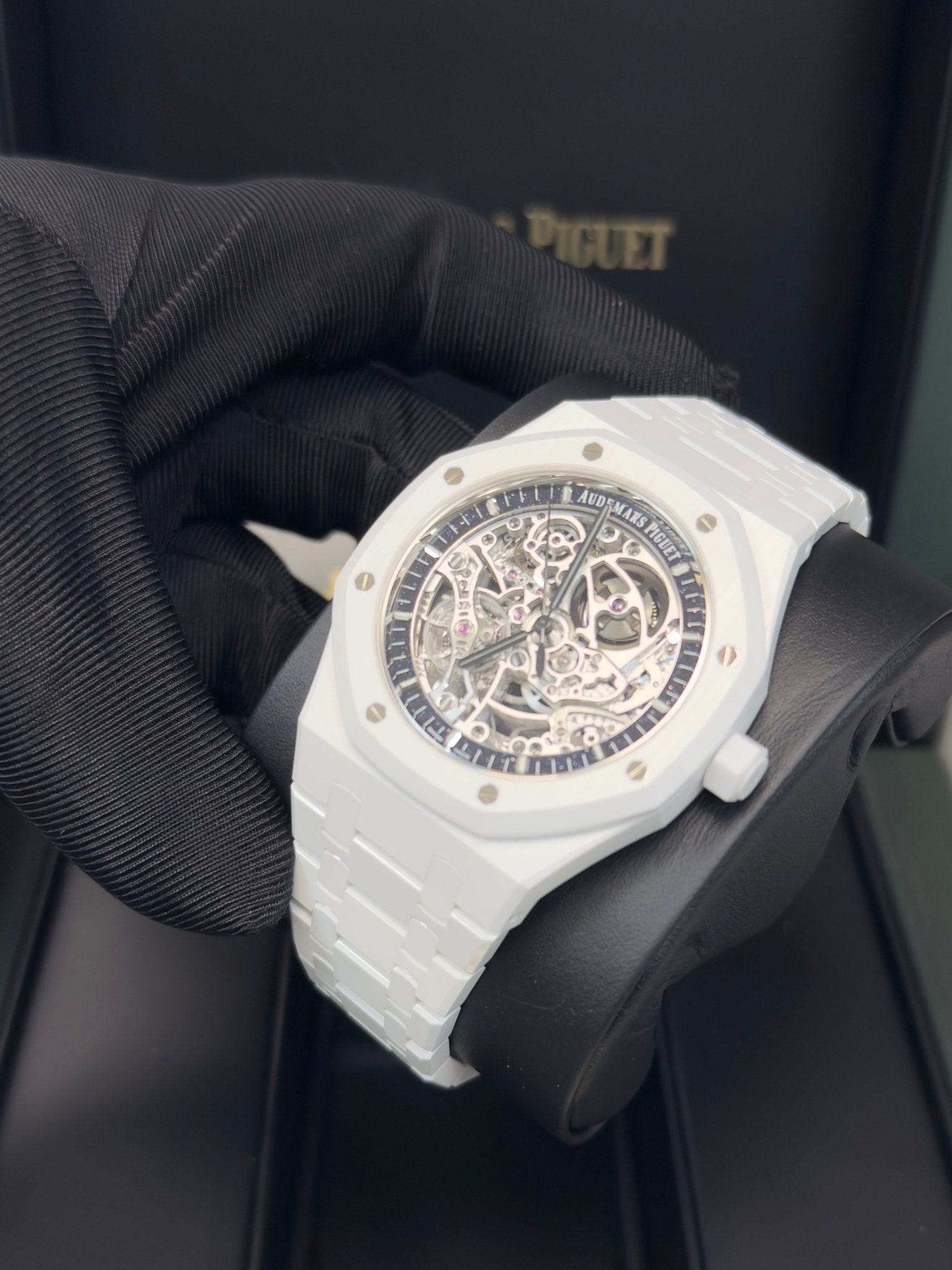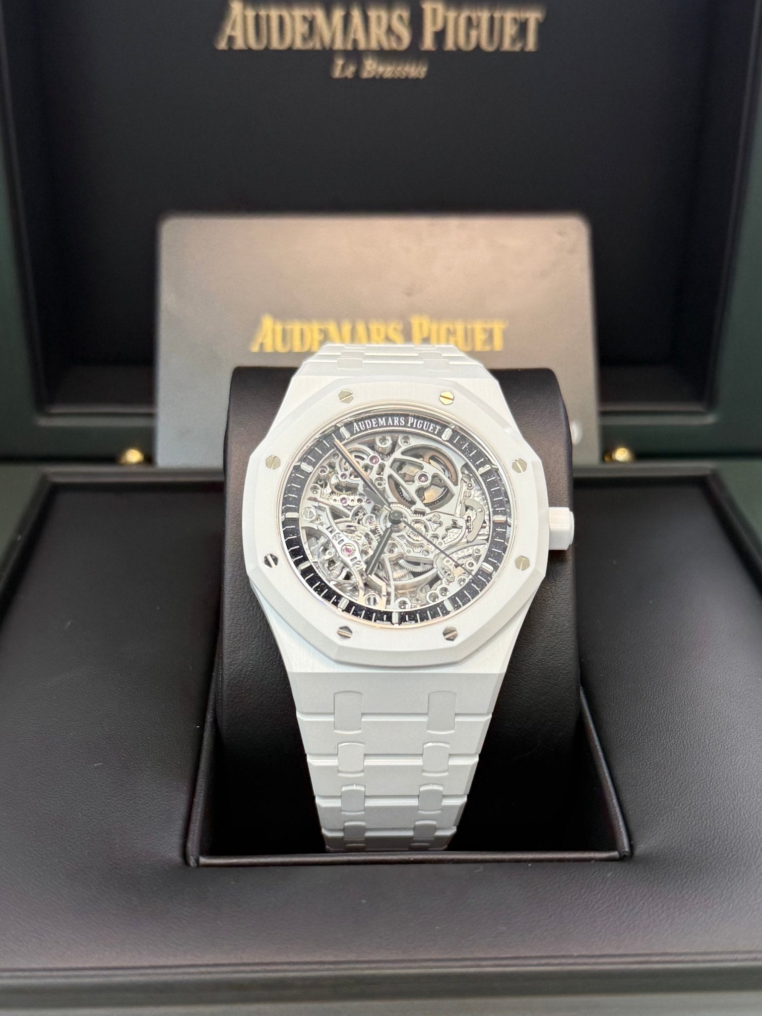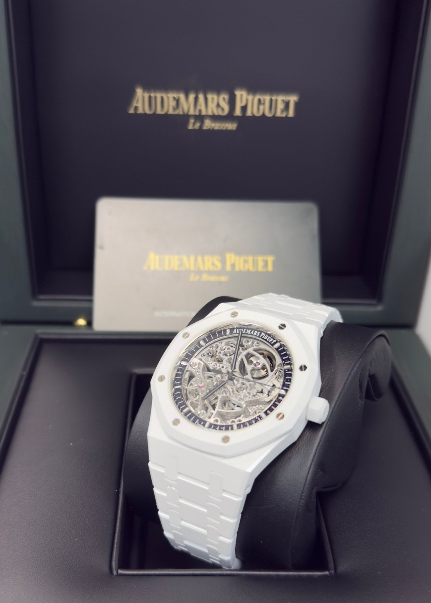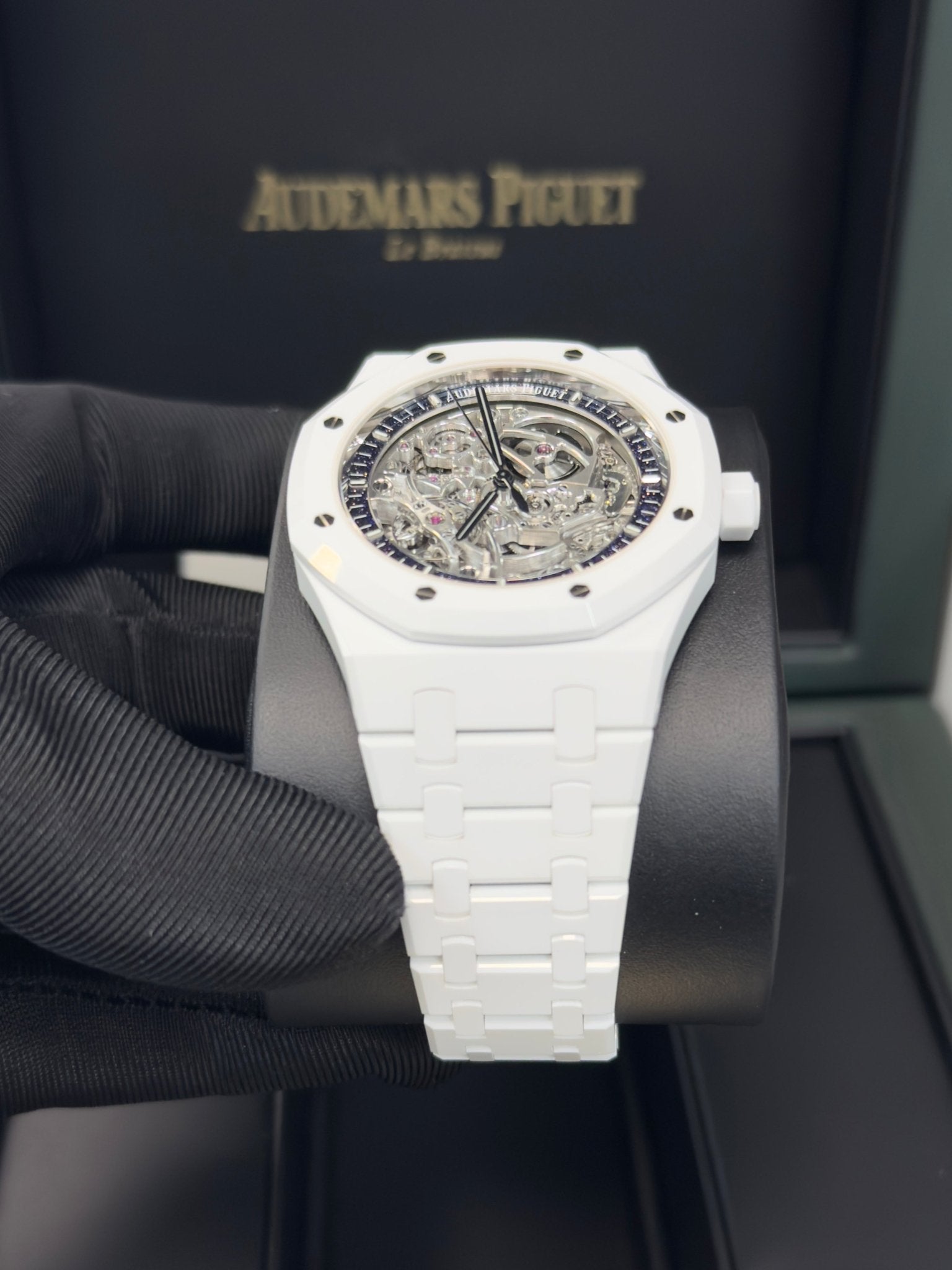 The white ceramic case and bracelet are complemented by a blue aventurine inner bezel elegantly framing the rhodium-toned openworked movement. The blackened Royal Oak hands and white gold hour-markers further this timepiece’s contrasted aesthetic. White ceramic case, glareproofed sapphire crystal and caseback, screw-locked crown. Blue aventurine inner bezel, white gold applied hour-markers and black Royal Oak hands with luminescent coating.