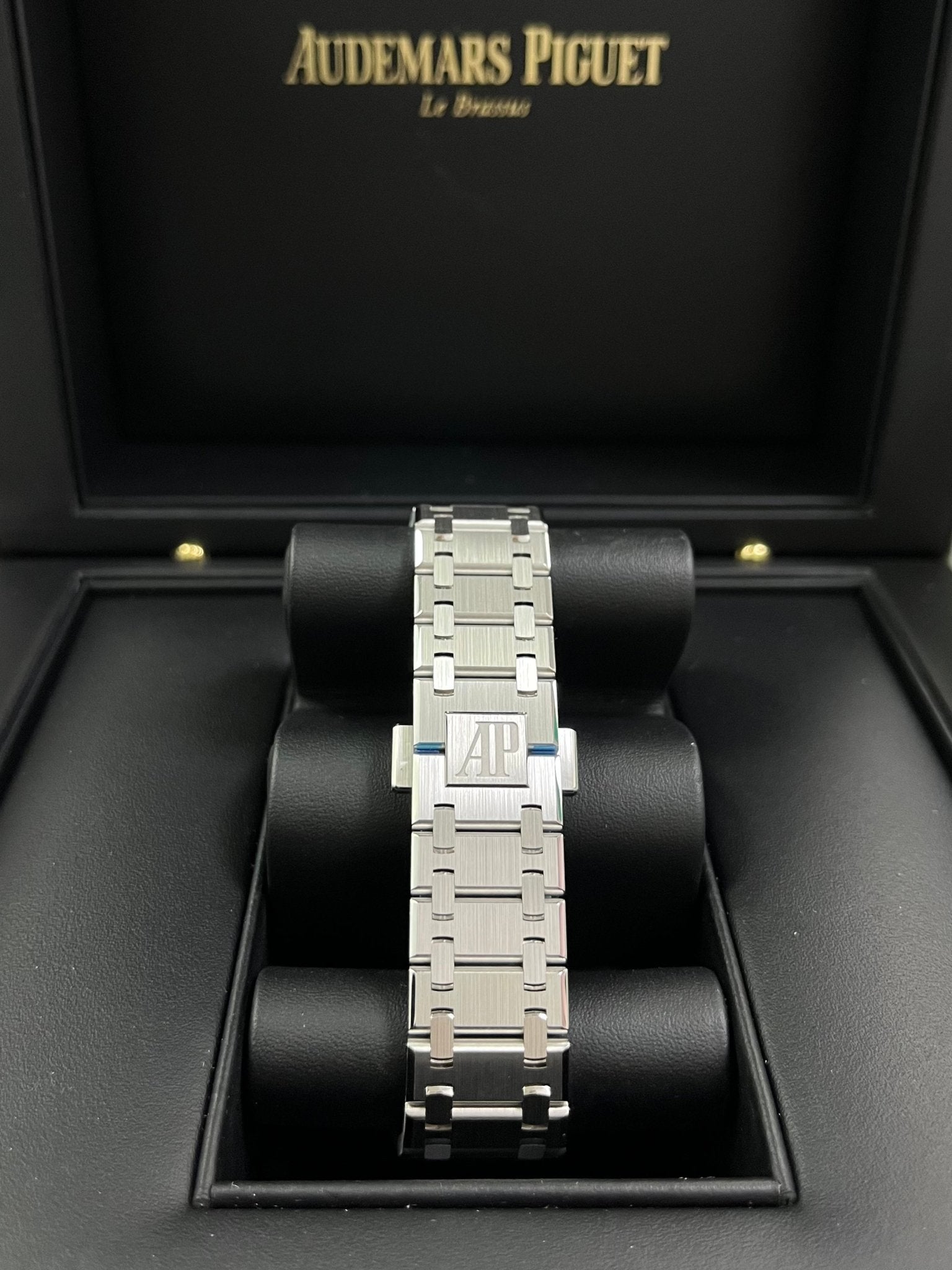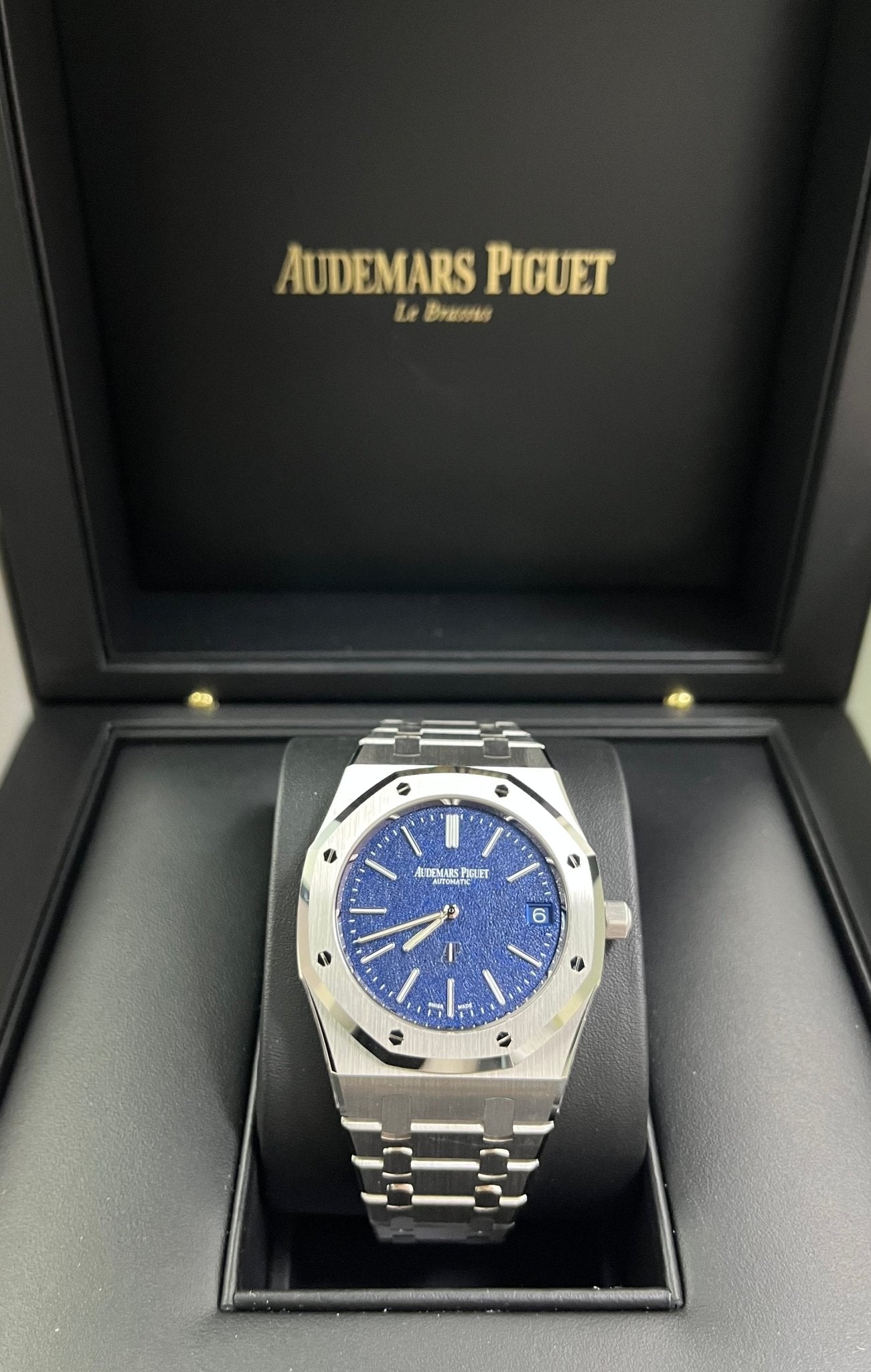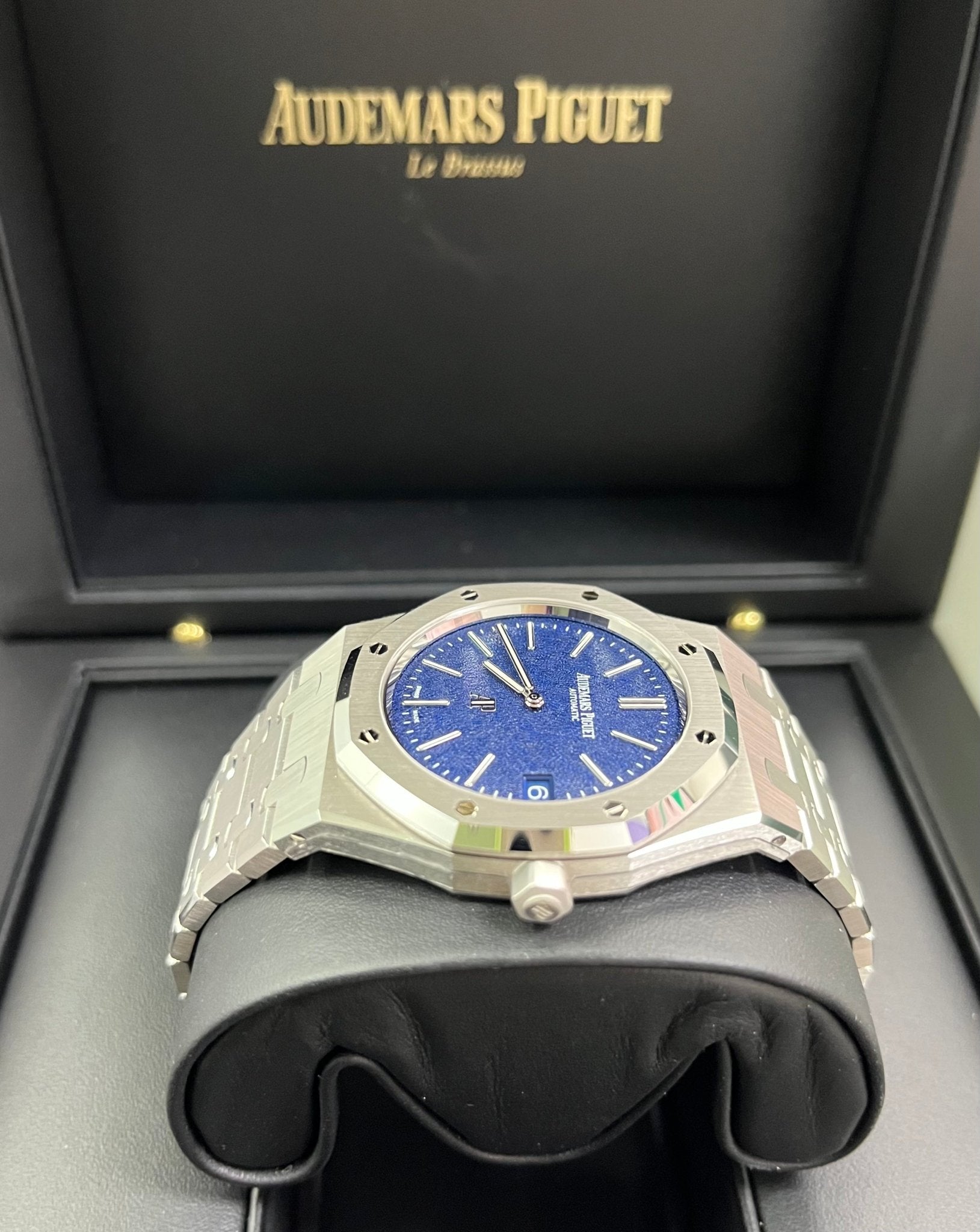 The introduction of a new grainy blue dial offers a new interpretation of the famous Royal Oak “Jumbo” model that is presented here in an extra-thin white gold case. 18-carat white gold case, glareproofed sapphire crystal and caseback. Blue dial with “grainy effect”, white gold applied hour-markers and Royal Oak hands with luminescent coating.18-carat white gold bracelet with AP folding clasp.