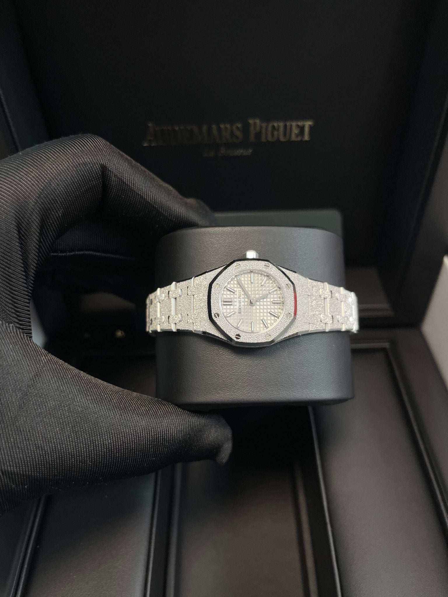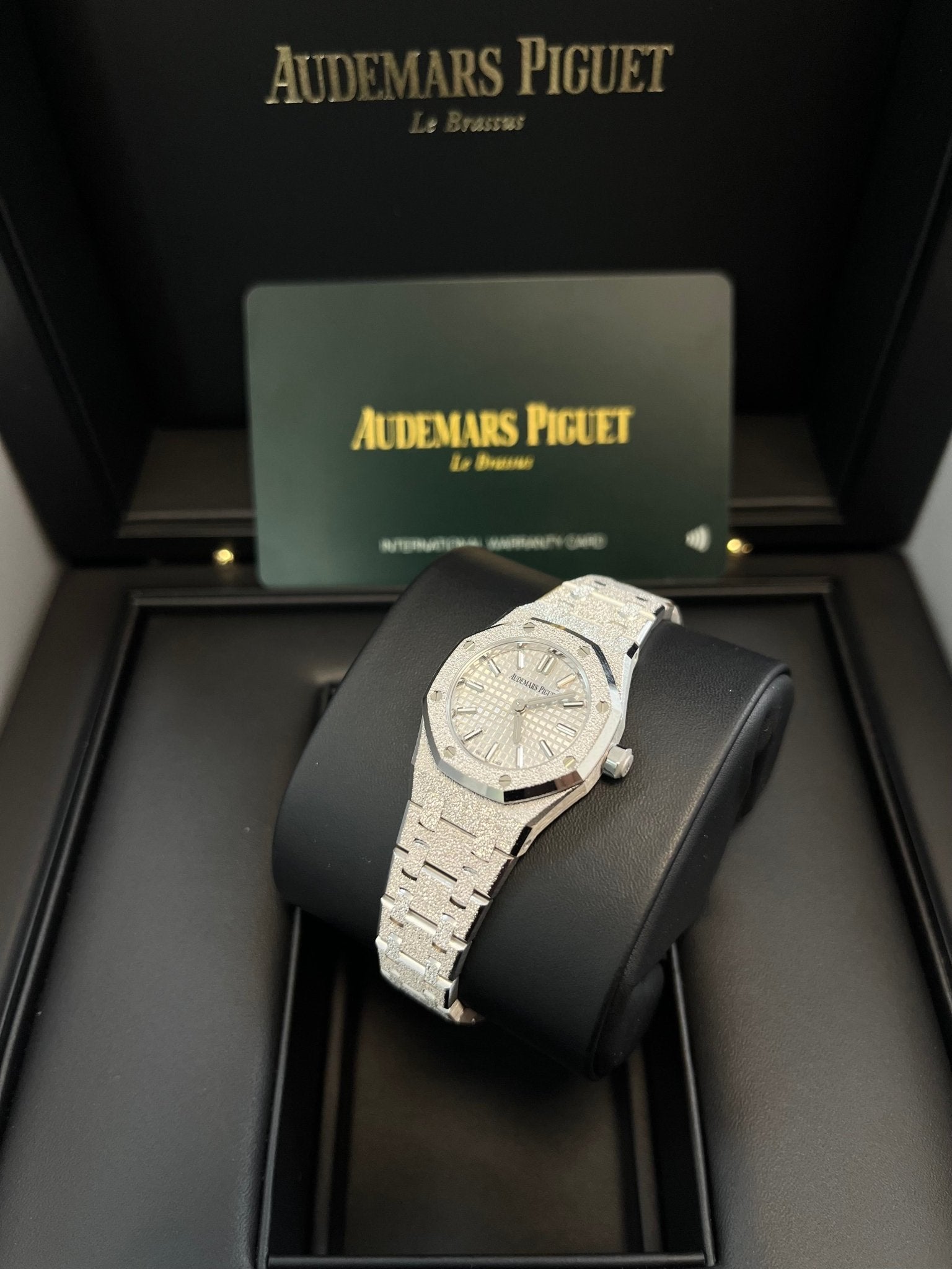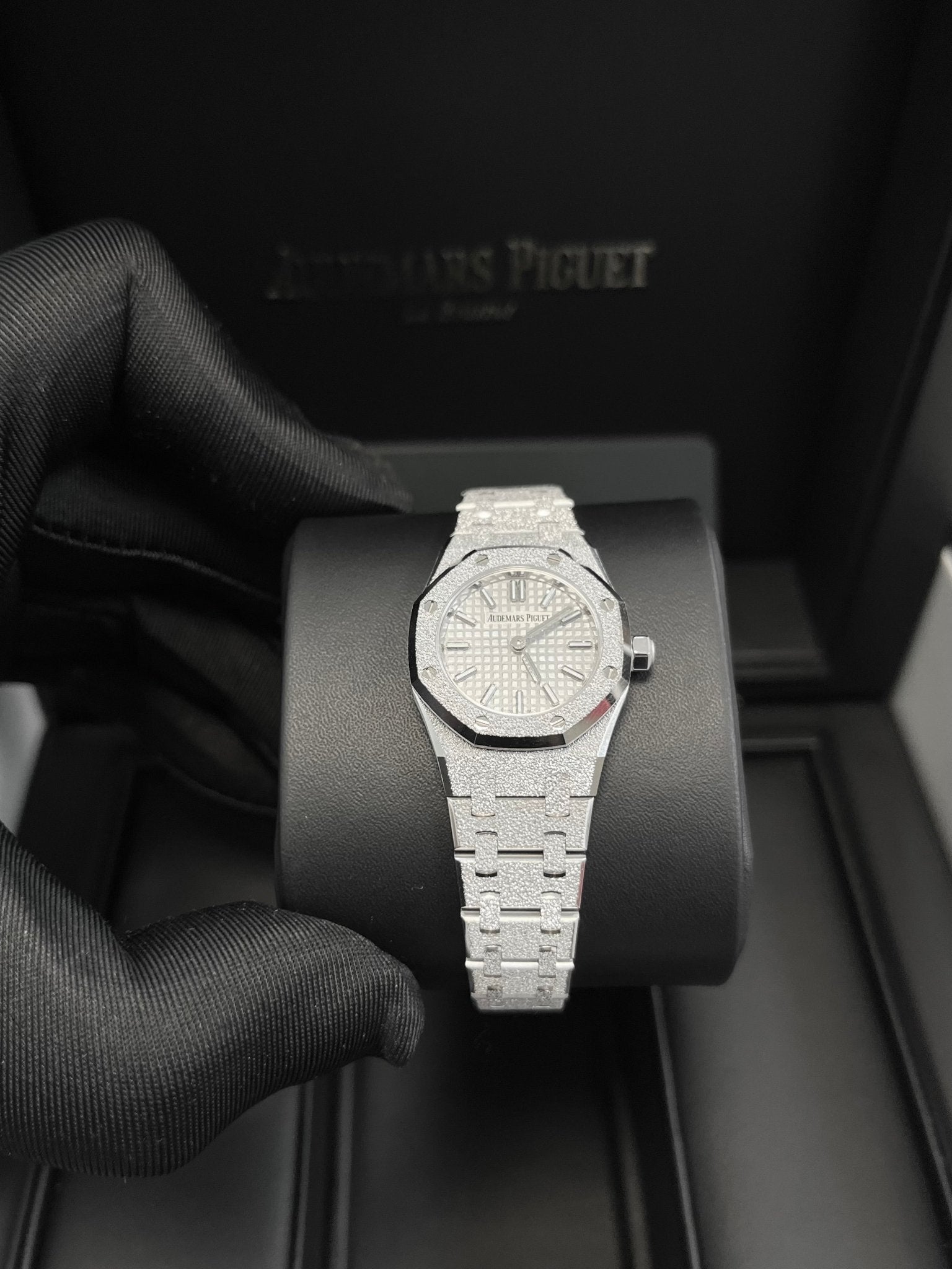 White gold-toned dial with “Petite Tapisserie” pattern, white gold applied hour-markers and Royal Oak hands with luminescent coating.