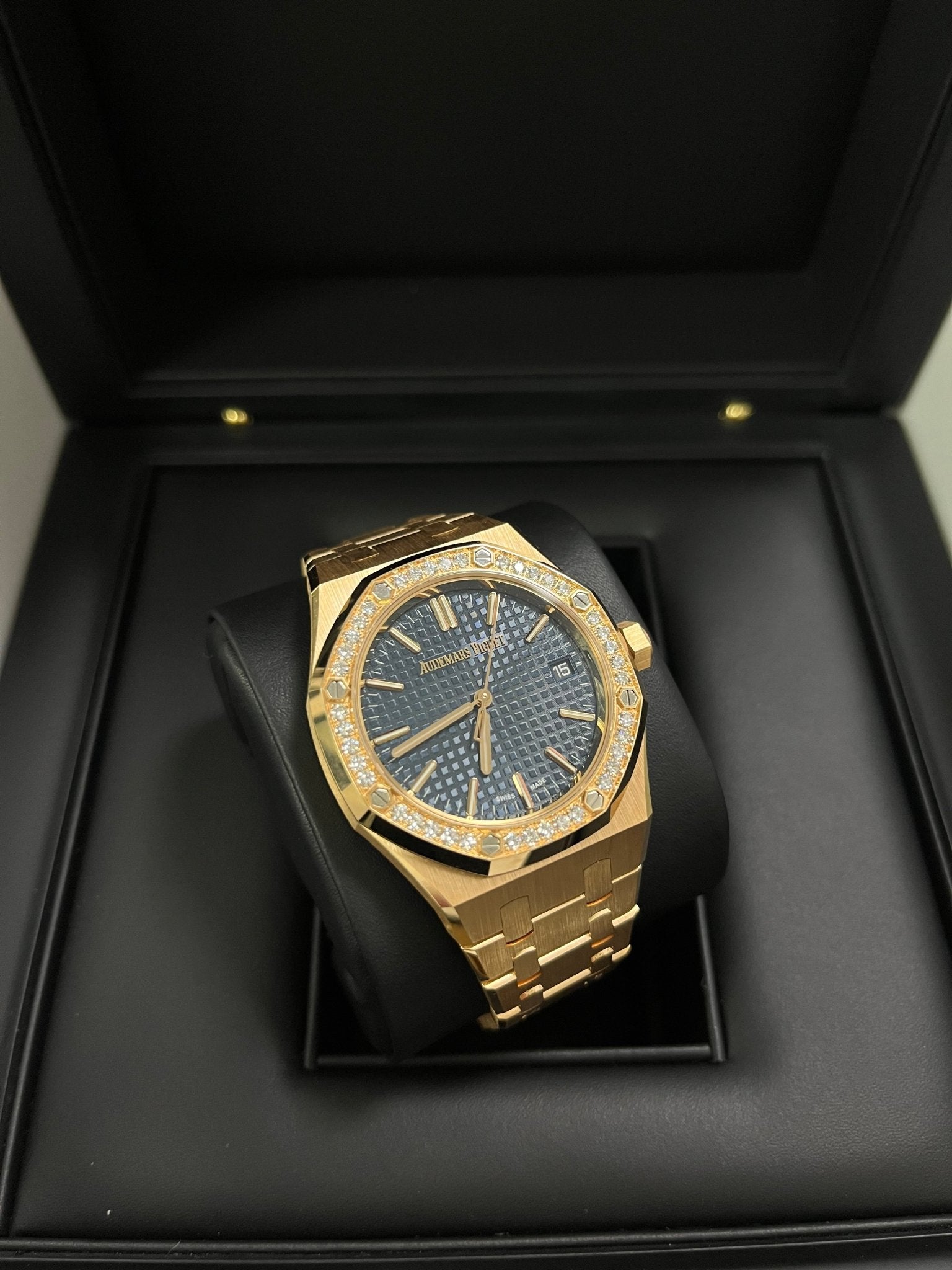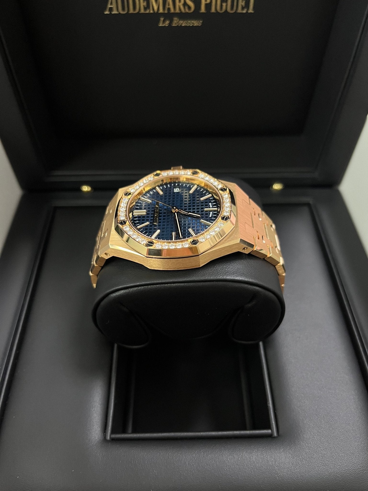 “Bleu nuit nuage 50” dial with “Grande Tapisserie” pattern, pink gold applied hour-markers and Royal Oak hands with luminescent coating.