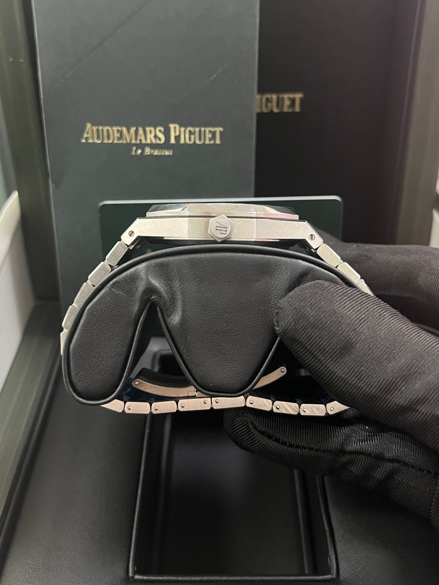 41mm stainless steel case, 10.4 mm thick, sapphire crystal back, glare-proofed sapphire crystal, black dial with Méga Tapisserie pattern, white gold applied hour-markers and Royal Oak hands with luminescent coating. Calibre 4302 selfwinding movement with hours, minutes, centre seconds, and date, approximately 70 hours of power reserve, stainless steel bracelet, AP folding buckle. Water-resistant up to 50 meters.