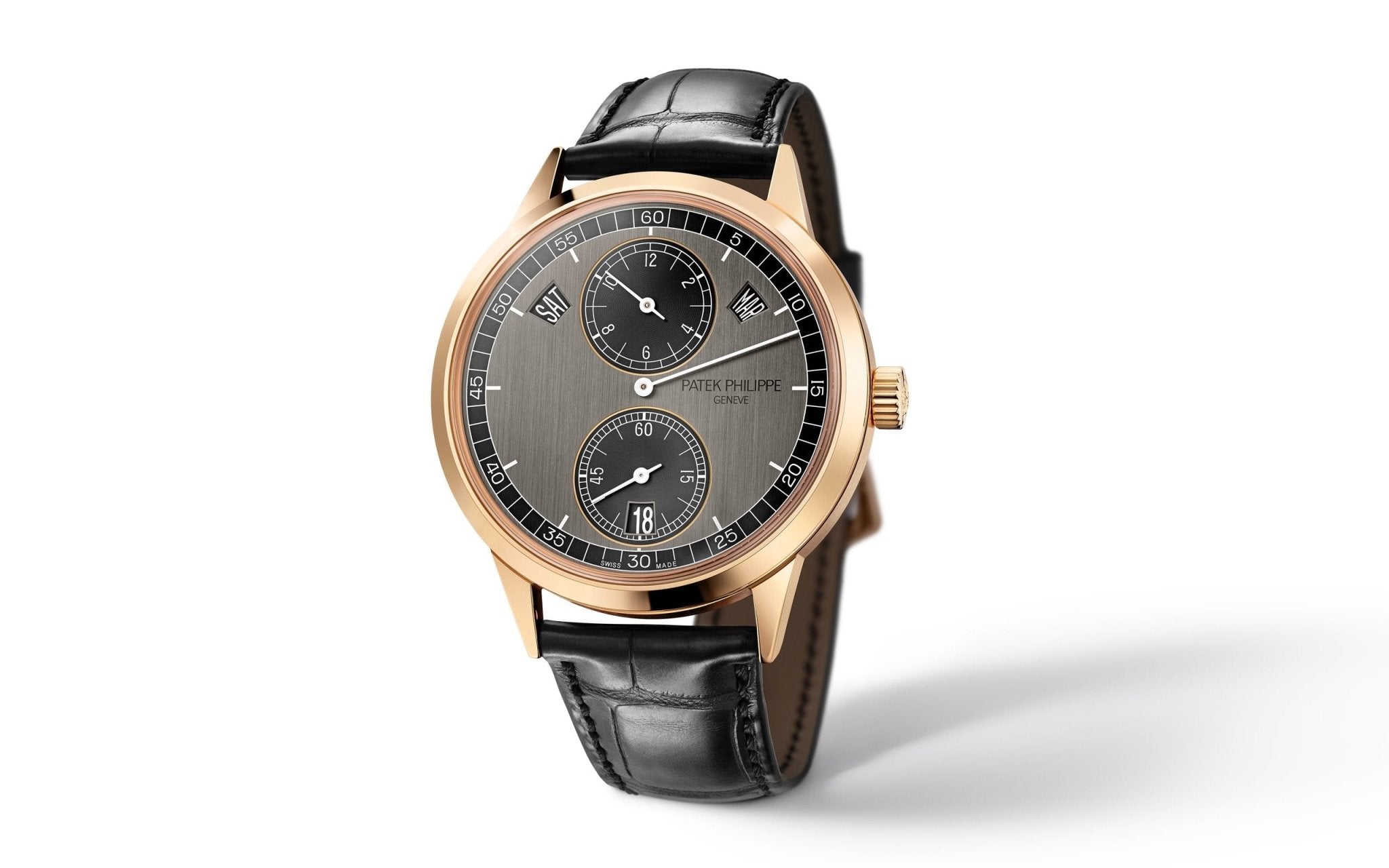 Patek Philippe revisits the unique style of its Annual Calendar Regulator by presenting it in rose gold, paired with a two-tone dial in graphite and ebony-black with a vertical satin finish.