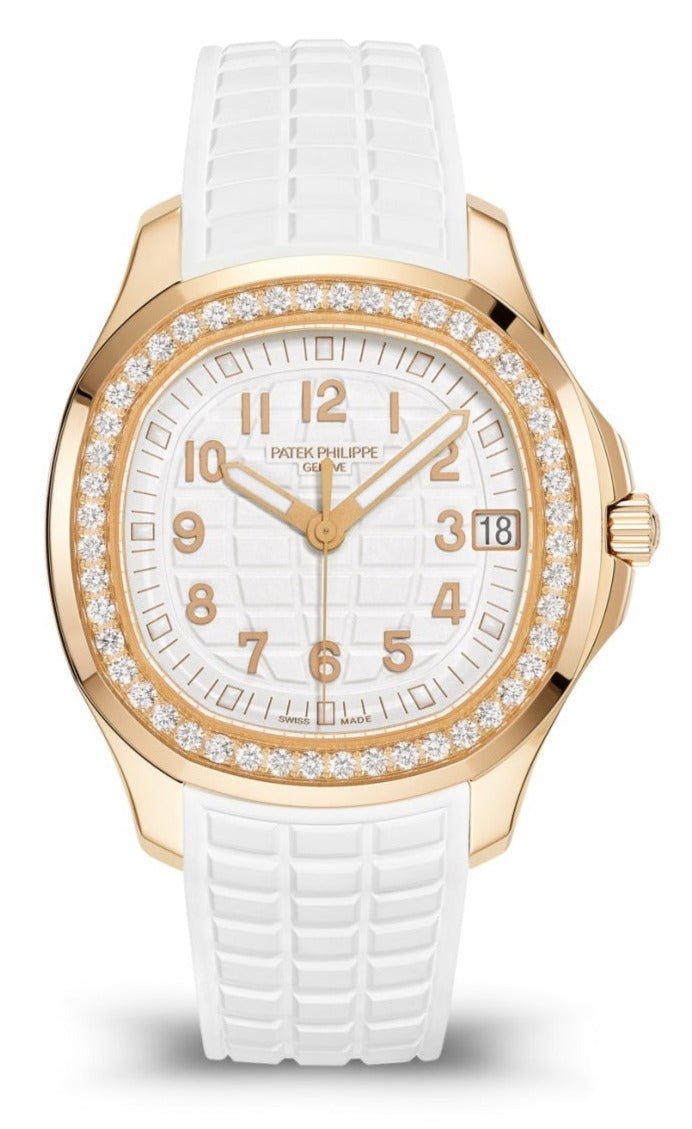 38.8 mm rose gold case, 8.5 mm thick, sapphire-crystal back, bezel set with 48 diamonds (~1.11 ct), matte white dial with embossed with Aquanaut pattern and gold applied numerals, caliber 26-330 S C self-winding movement with sweep seconds hand, approximately 35-45 hours of power reserve, matte white composite material strap, Aquanaut fold-over buckle. Water resistant to 120 m.