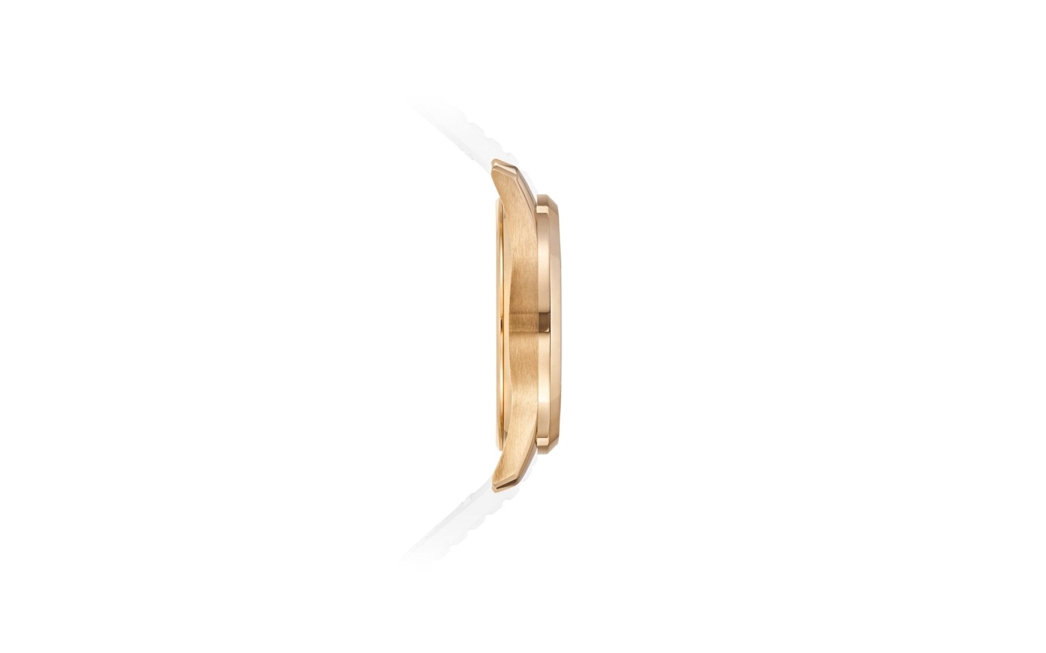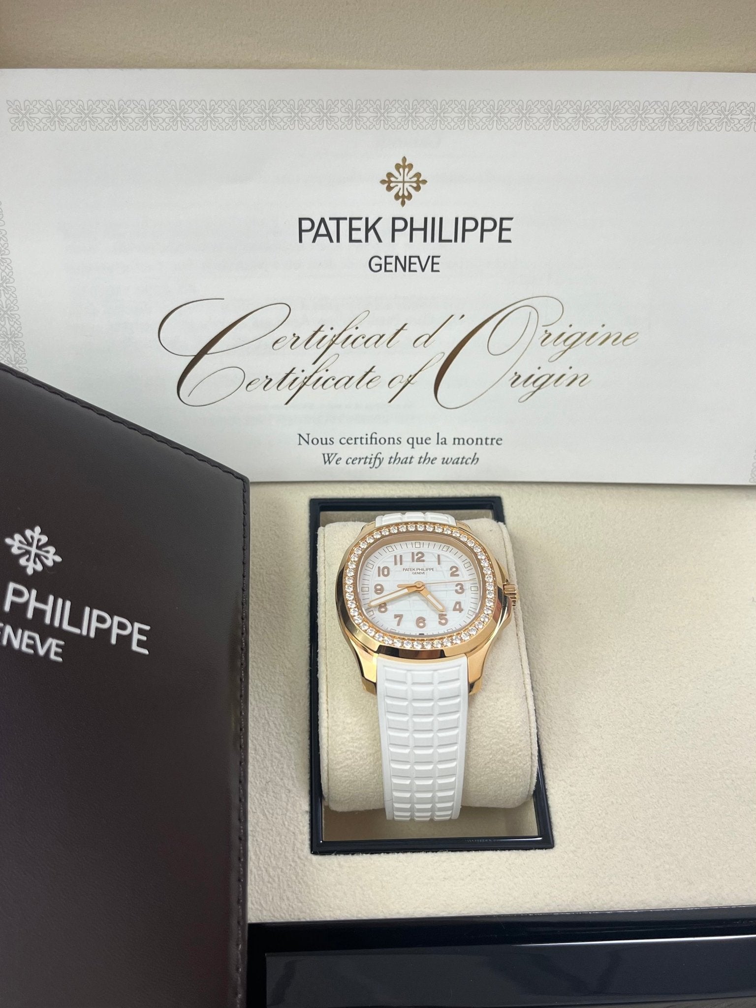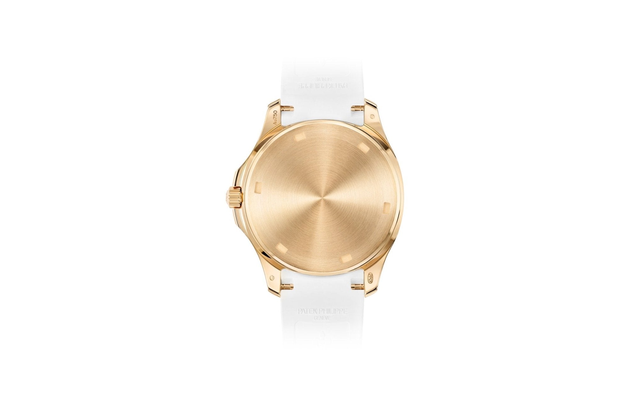 38.8 mm rose gold case, 8.77 mm thick, solid back, bezel set with 48 diamonds (~1.11 ct), matte white dial with embossed with Aquanaut pattern and gold applied numerals, caliber E 23-250 S FUS 24H quartz movement with two time zones: local and home time indication, day/night indication for home time in an aperture at 6 o’clock, sweep seconds, matte white composite material strap, Aquanaut fold-over buckle. Water resistant to 120 m.