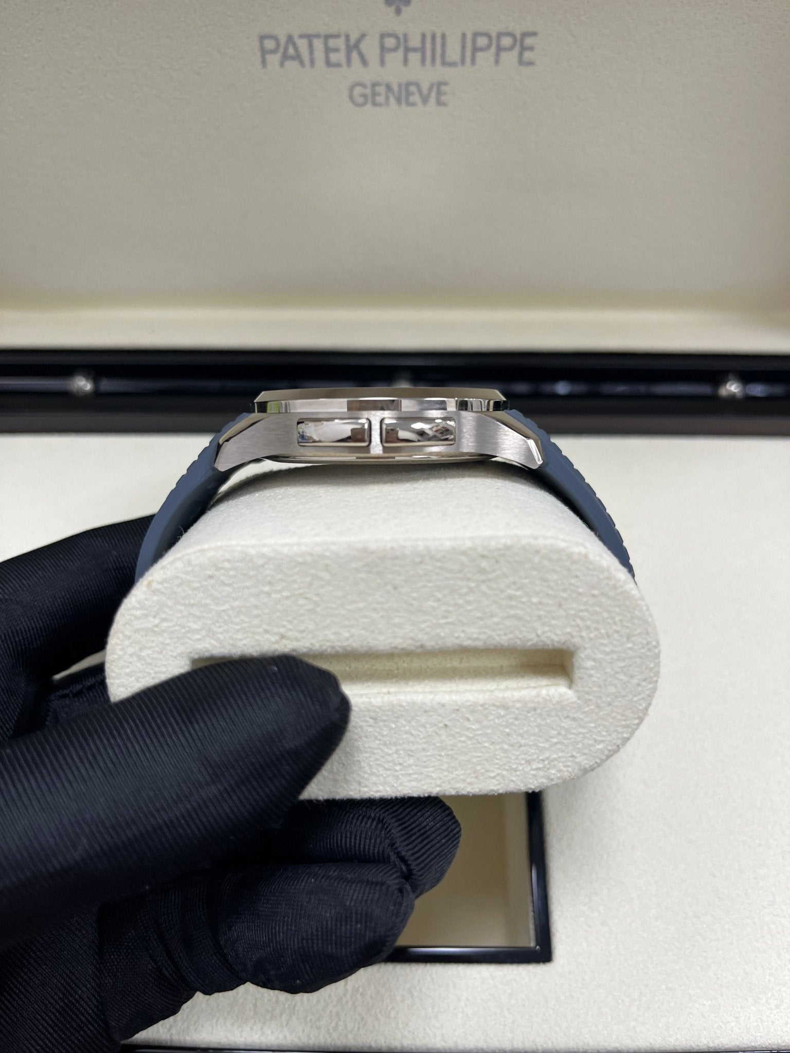 The opaline blue-gray dial is adorned with the emblematic Aquanaut pattern, while the integrated composite strap matching the dial color features a patented white gold fold-over clasp.