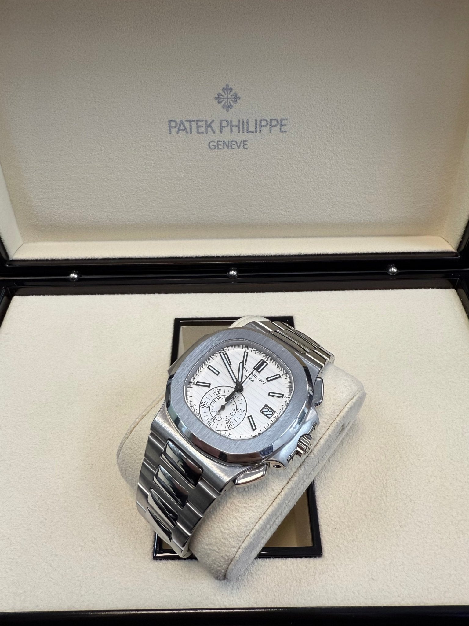 Patek Philippe Nautilus Chronograph (ref. 5980/1A), featuring a mechanical automatic movement; white dial; chronograph complication with 60-minute and 12-hour counters together in a single elegant monocounter at 6 o’clock; date display at 3 o’clock; center sweep seconds hand, which also serves as the chronograph hand; and 40.5mm, stainless steel case with an integrated stainless steel, Nautilus-style bracelet.