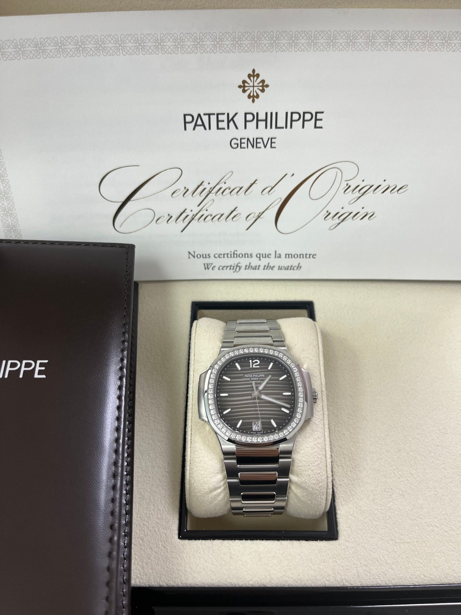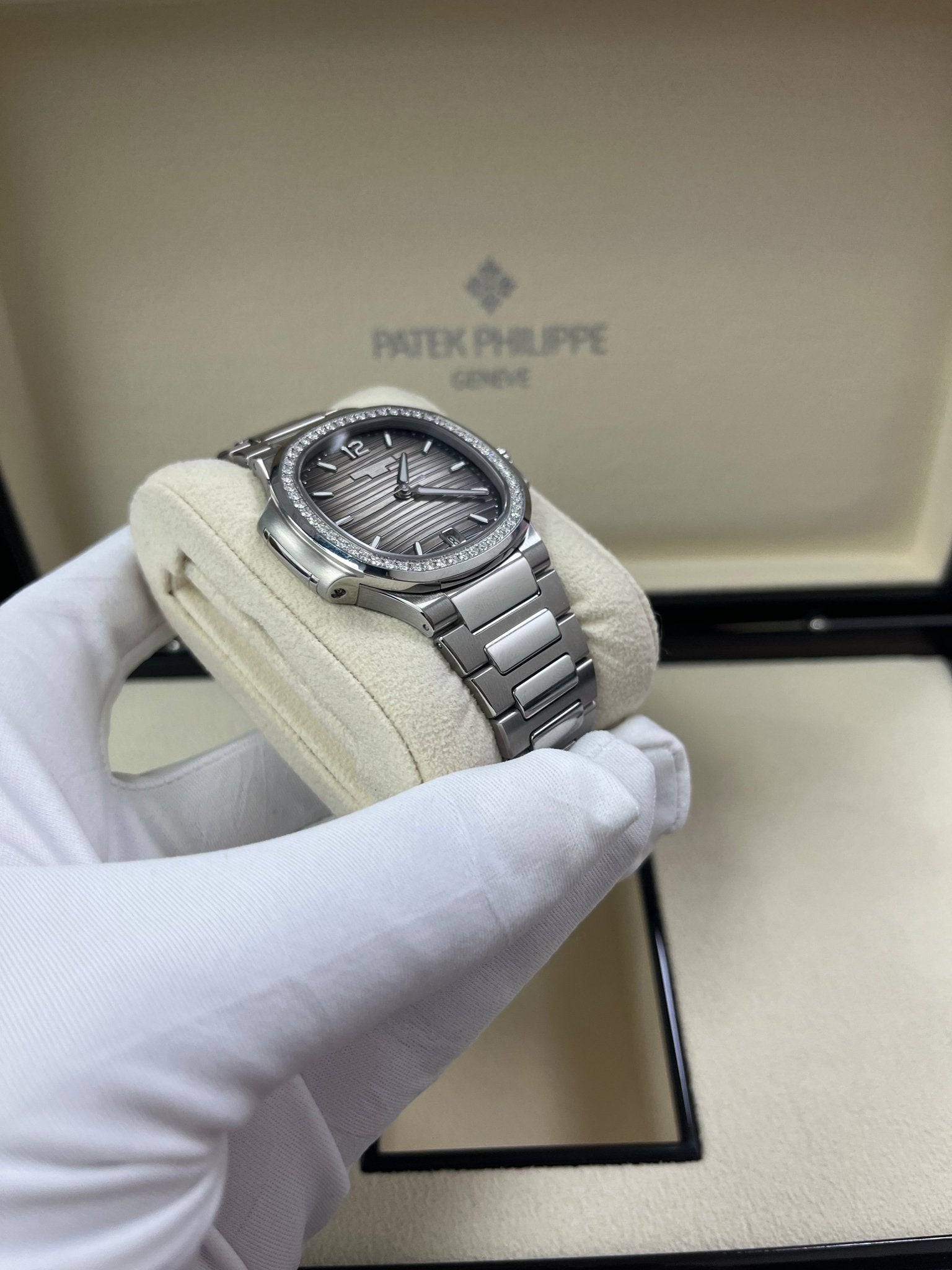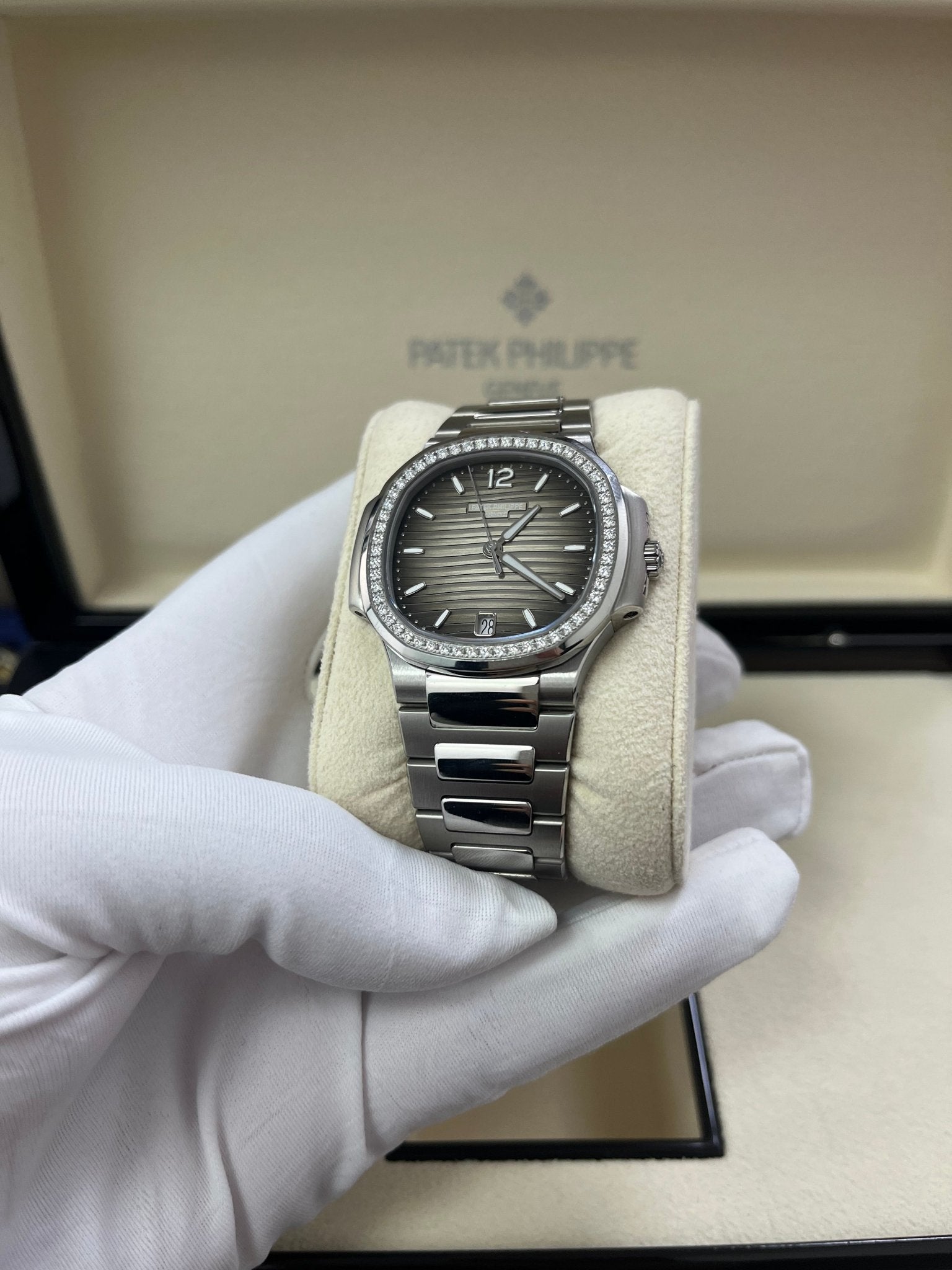 The Ladies Automatic Nautilus in steel with diamond-set bezel asserts its presence on the wrist with a slightly larger diameter (35.2 mm instead of 33.6 mm). Patek Philippe has also revised its range of dial colors, introducing blue opaline, silvery opaline or gray opaline, grading to black at the periphery.