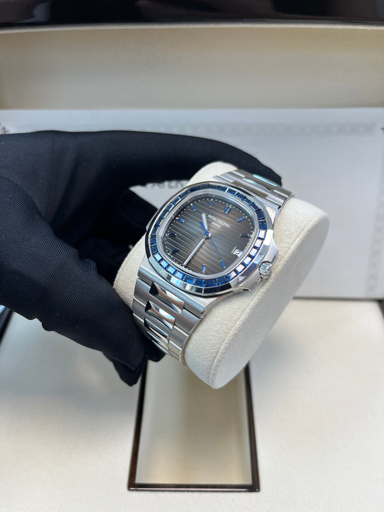 This Patek Philippe Nautilus is crafted in a 40mm platinum case, illuminated with a gem-set blue sapphire bezel, and styled on a platinum bracelet. The black dial hosts baguette-cut blue sapphire hour markers and a date window at 3 o’clock.