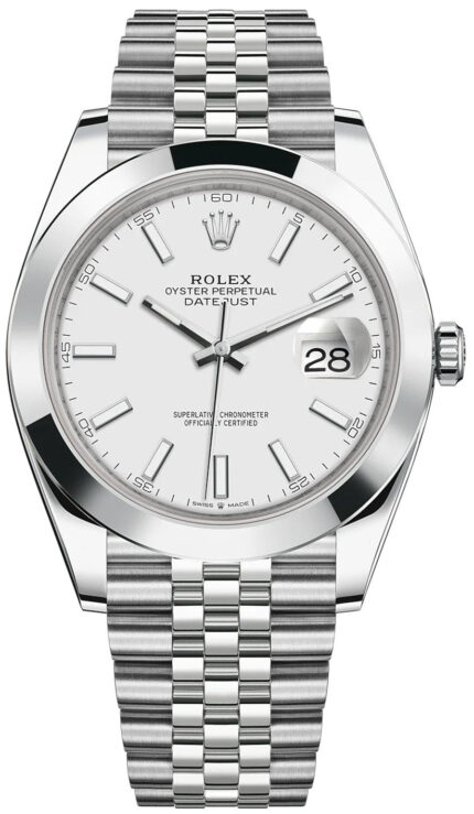 The entirely polished white gold case is paired with a blue-gray calfskin strap with denim pattern.