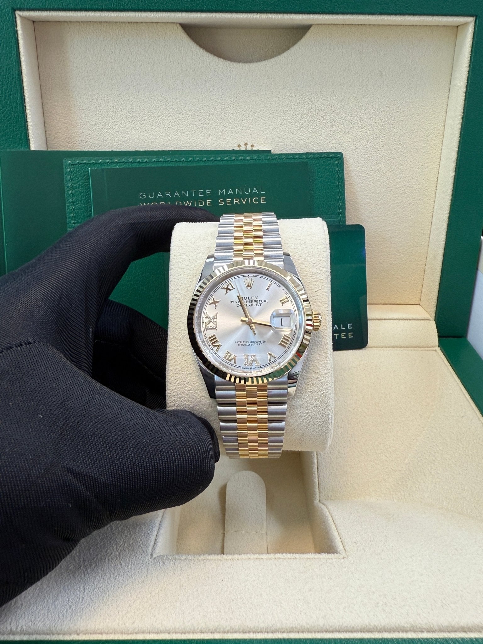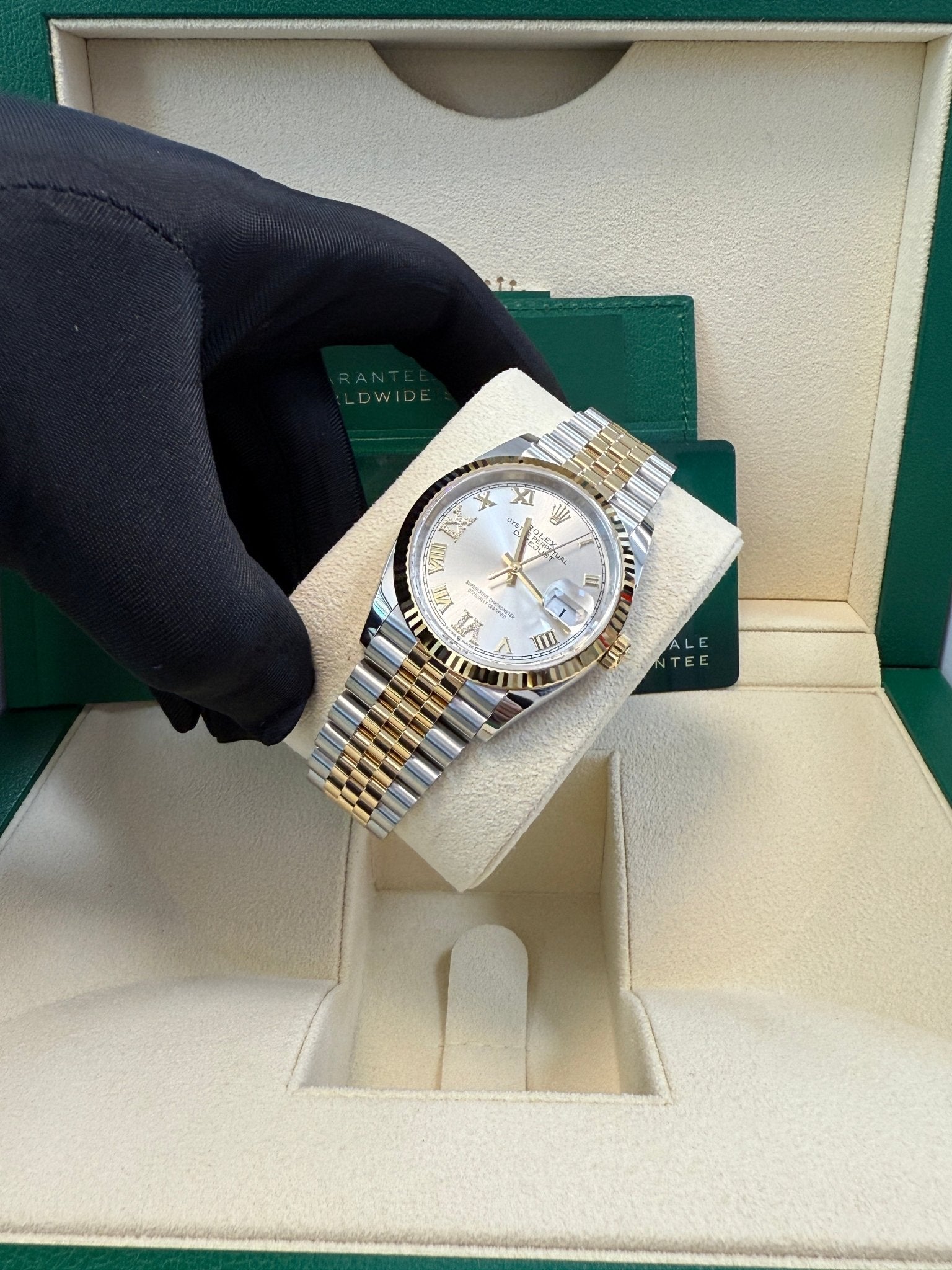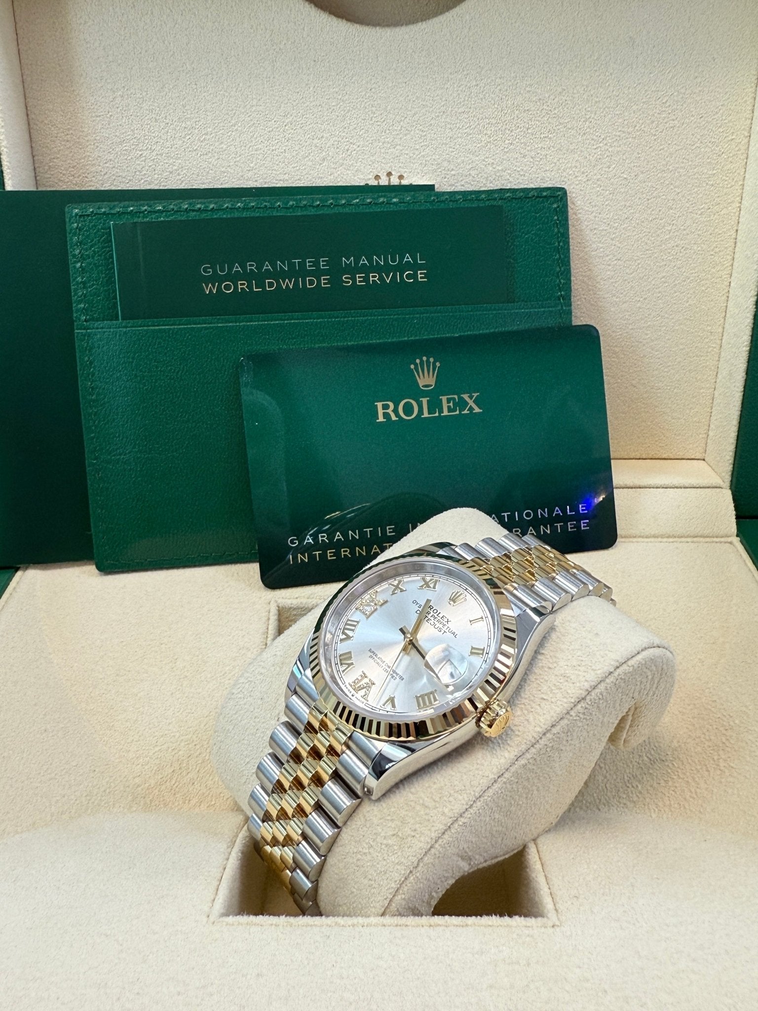 36mm yellow Rolesor case with Oystersteel monobloc middle case, screw-down steel back, screw-down 18K yellow crown, 18K yellow fluted bezel, silver dial, Roman numerals with diamond set 6 and 9, Rolex calibre 3235 self-winding movement with date at 3 o’clock, approximately 70 hours of power reserve, yellow Rolesor Jubilee bracelet with five-piece links, folding Oysterclasp buckle with Easylink 5mm comfort extension link. Waterproof to 100 meters. Redesigned for Baselworld 2018 with updated case sides, lugs, and calibre 3235 movement.