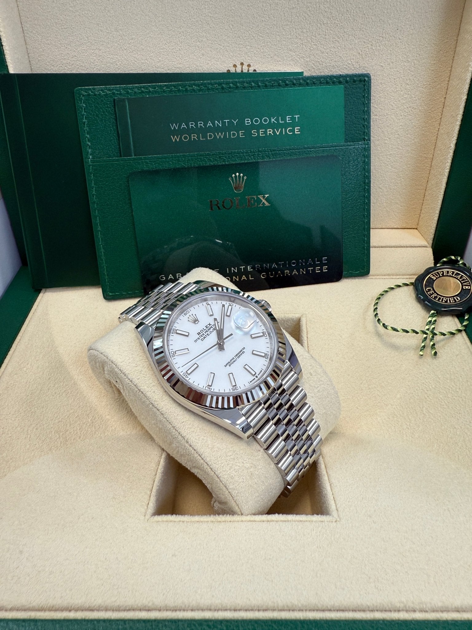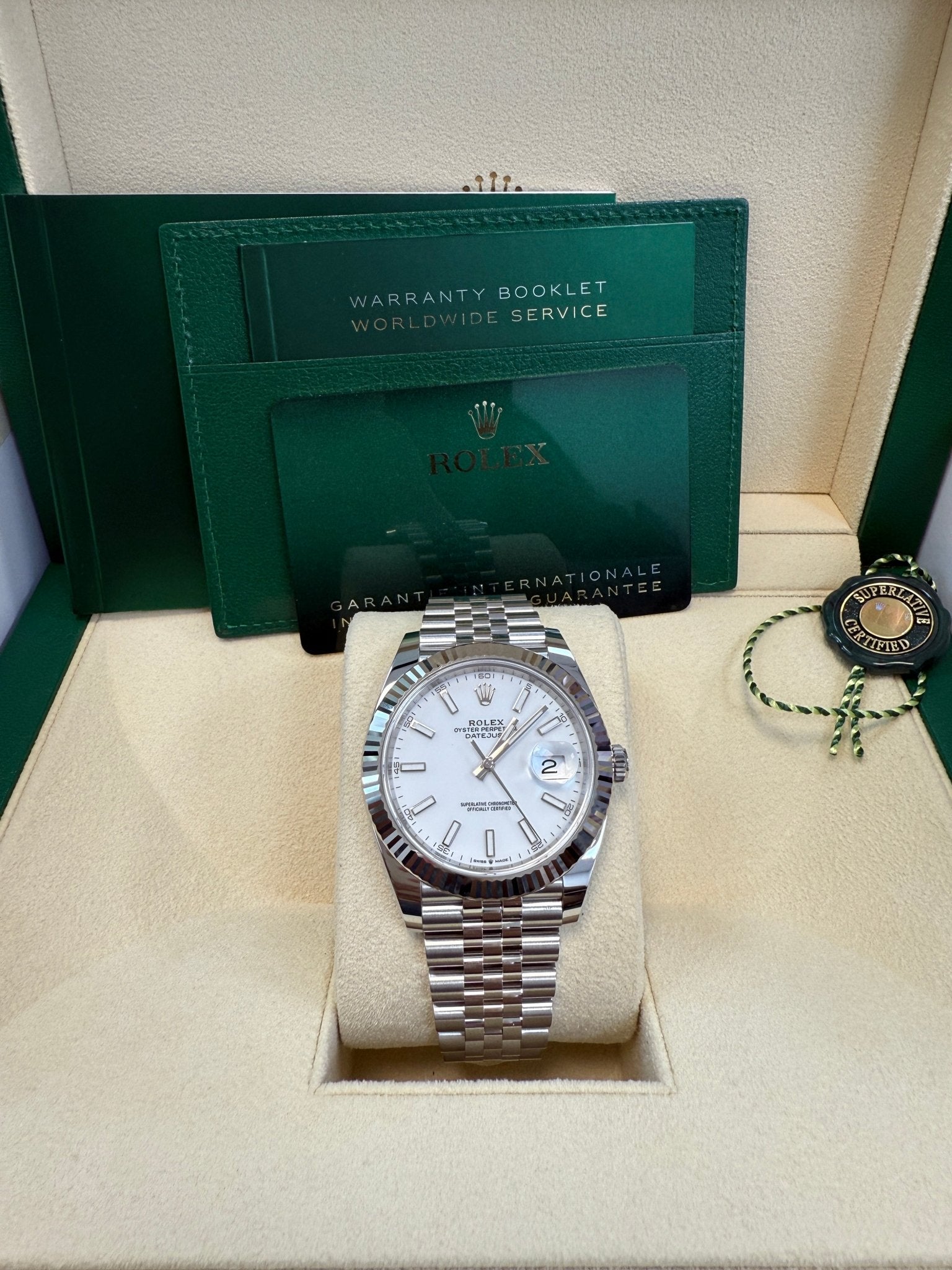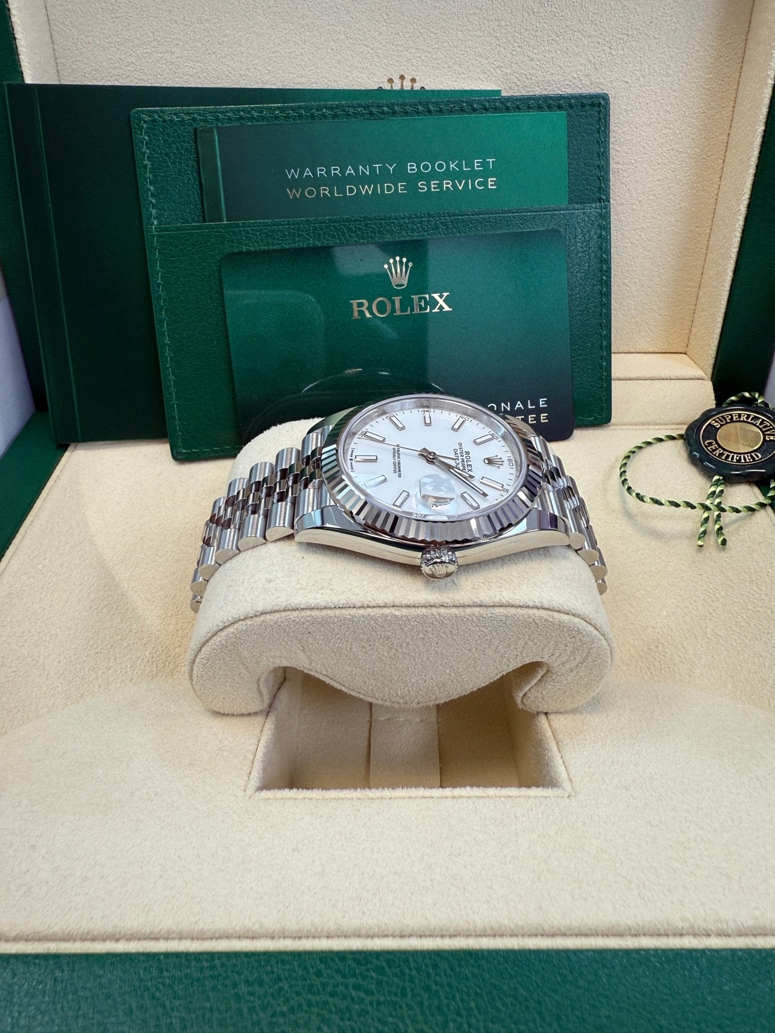 41mm white Rolesor case comprised of a 904L steel monobloc middle case, screw-down steel back, screw-down crown with twin lock double waterproofness system, 18K white gold fluted bezel, scratch-resistant double anti-reflective sapphire crystal with cyclops lens over the date, white dial, index hour markers. Rolex calibre 3235 perpetual self-winding movement with date at 3 o’clock that changes instantaneously at midnight in a few thousandths of a second, approximately 70 hours of power reserve, 904L steel Jubilee bracelet with five-piece links, folding Oysterclasp buckle with Easylink 5mm comfort extension link. Waterproof up to 100 meters.