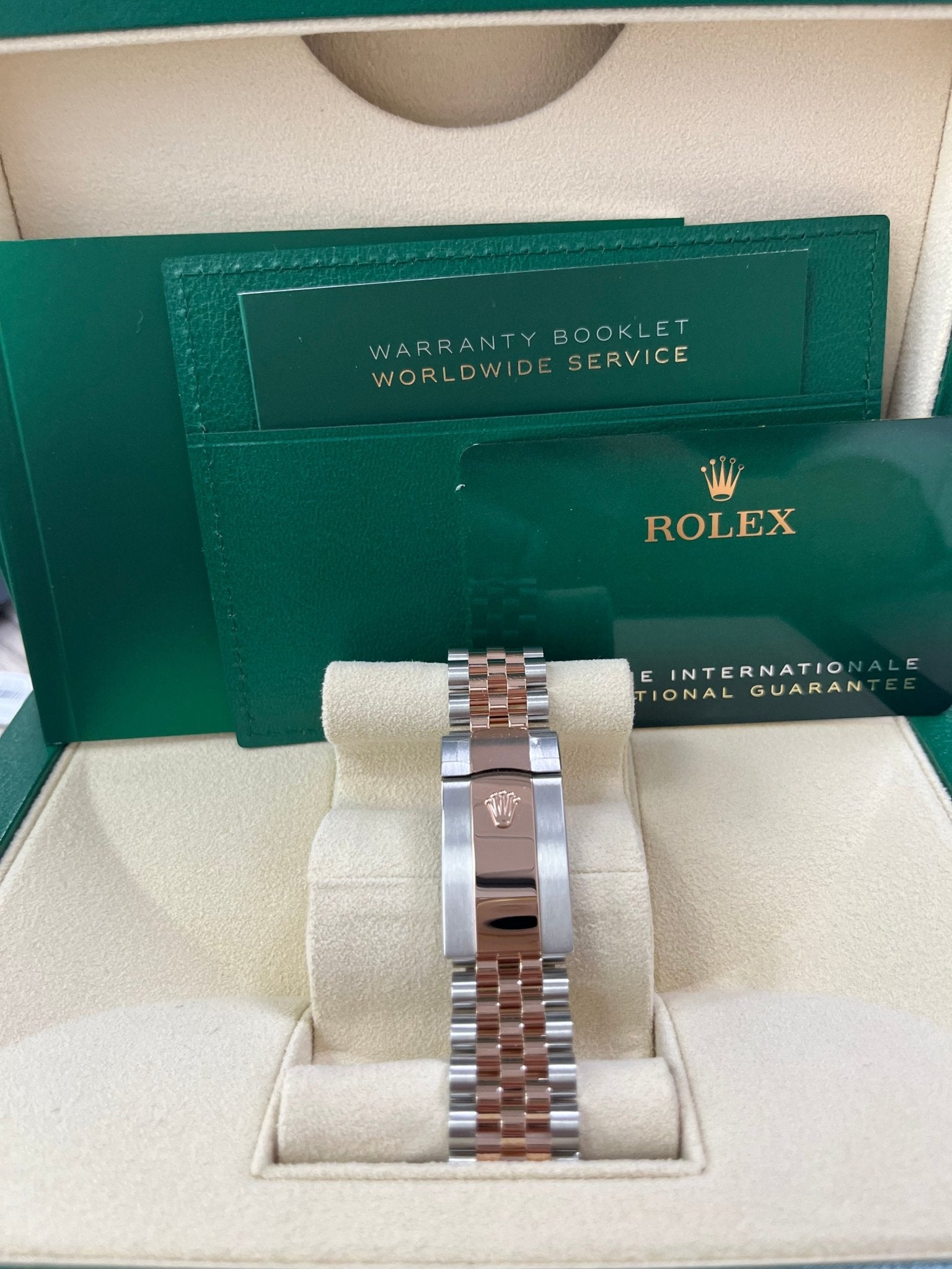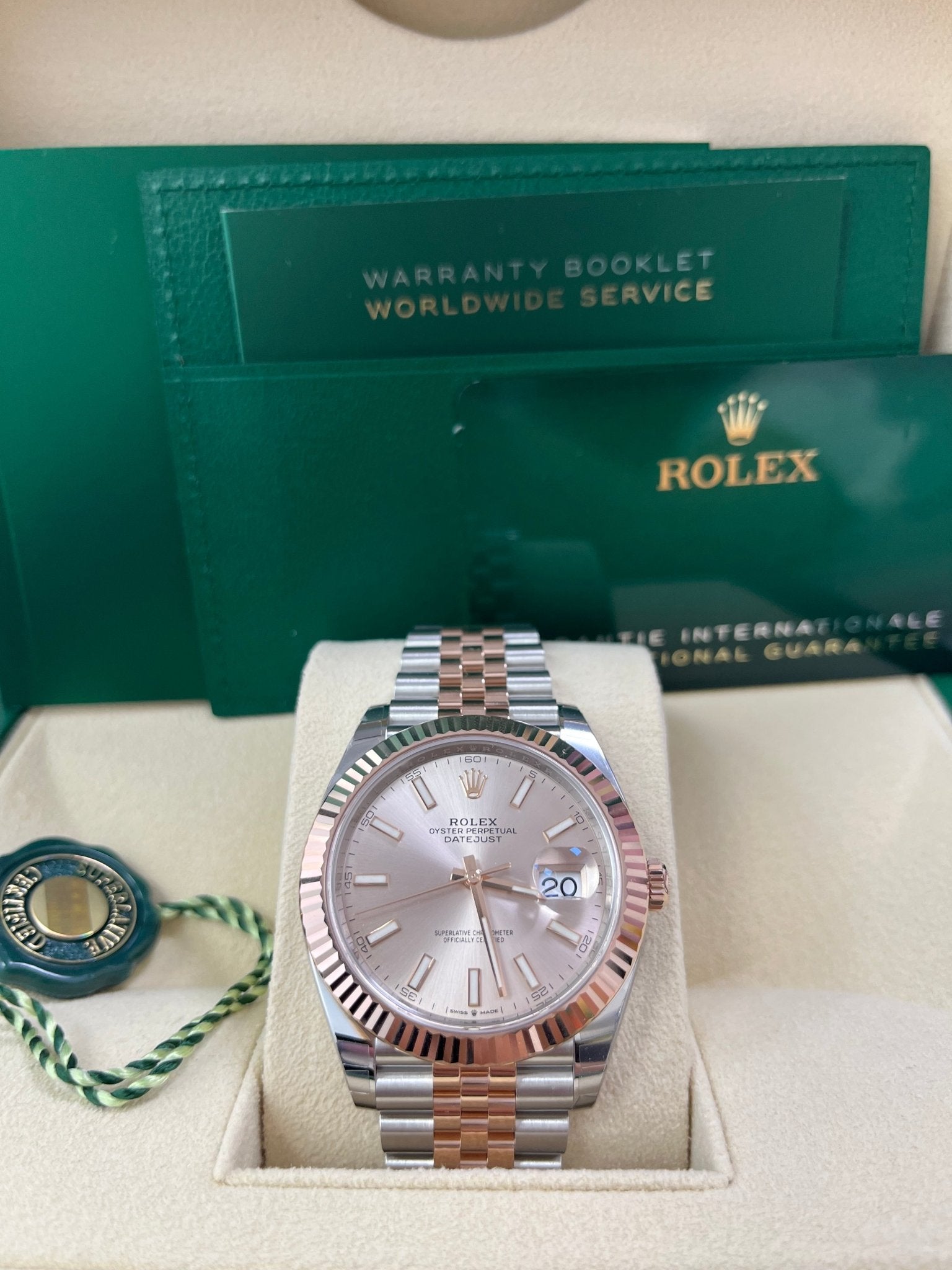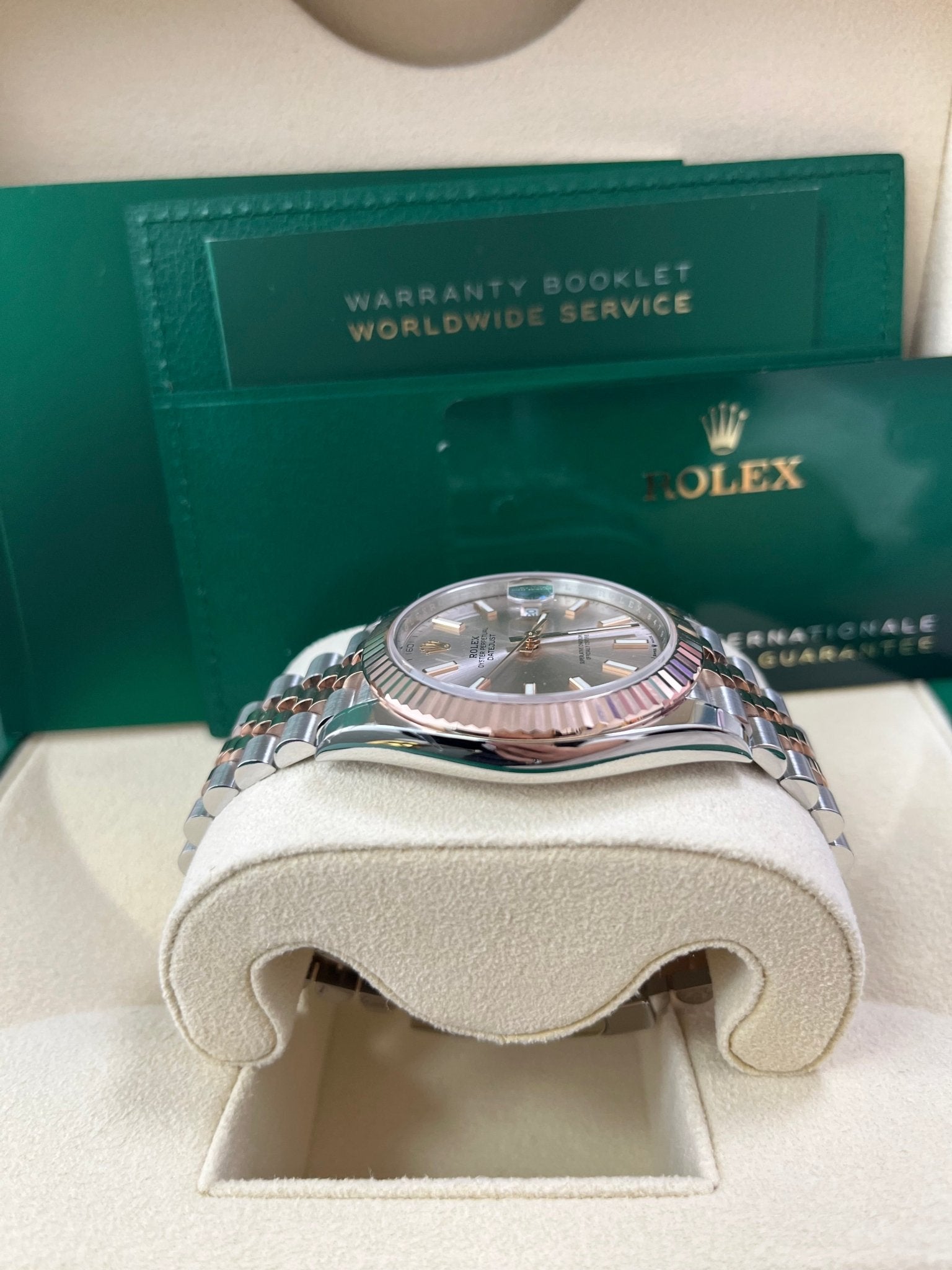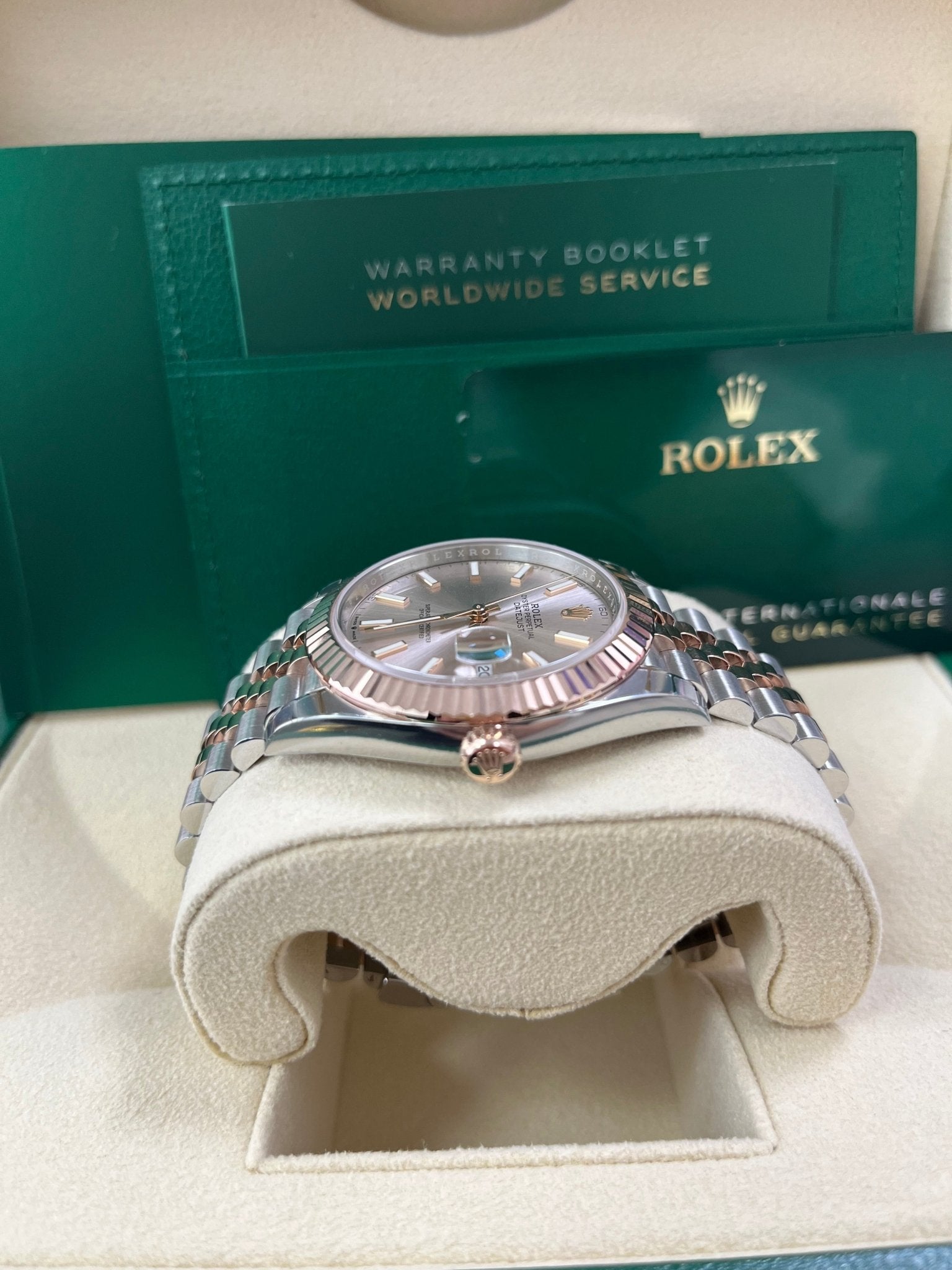 41mm Everose Rolesor case with 904L steel monobloc middle case, screw-down steel back, 18K Everose gold screw-down crown, 18K Everose gold fluted bezel, scratch-resistant double anti-reflective sapphire crystal with cyclops lens over the date, sundust dial, index hour markers, Rolex calibre 3235 perpetual self-winding movement with date at 3 o’clock that changes instantaneously at midnight in a few thousandths of a second, approximately 70 hours of power reserve, Everose Rolesor Jubilee bracelet made from a combination of 904L steel and 18K Everose gold with five-piece links, folding Oysterclasp buckle with Easylink 5mm comfort extension link. Waterproof to 100 meters.