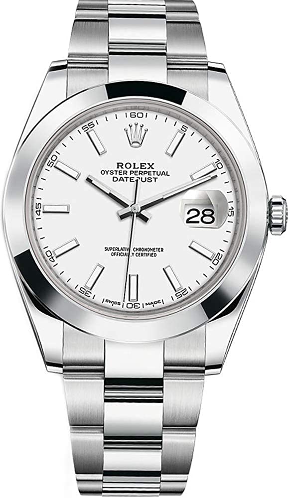 41mm 904L stainless steel case, screw-down steel back, screw-down crown with twinlock double waterproofness system, smooth bezel, scratch-resistant double anti-reflective sapphire crystal with cyclops lens over the date, white dial, index hour markers, Rolex calibre 3235 perpetual self-winding movement with date at 3 o’clock that changes instantaneously at midnight in a few thousandths of a second, approximately 70 hours of power reserve, 904L steel Oyster bracelet with flat three-piece links, folding Oysterclasp buckle with Easylink 5mm comfort extension link. Waterproof to 100 meters.