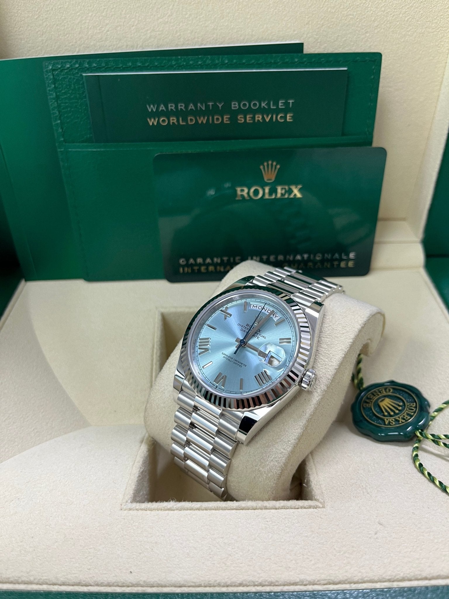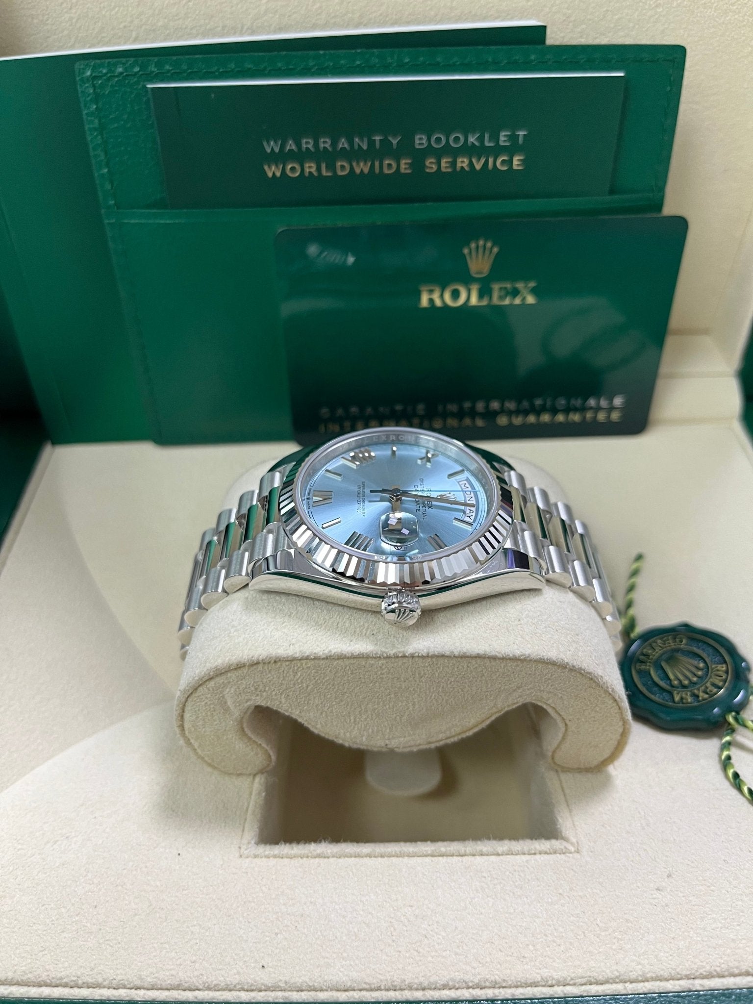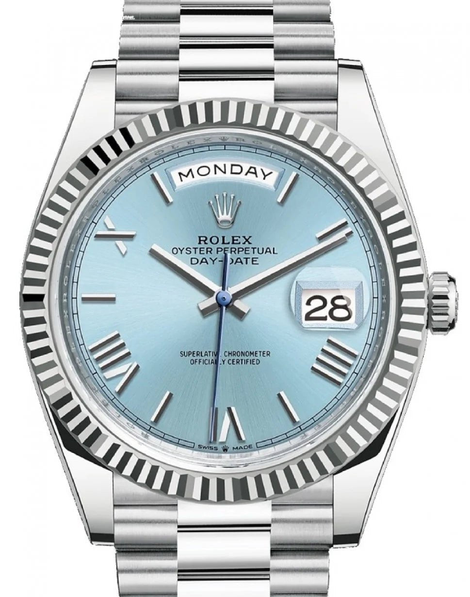 Rolex Day-Date 40 Platinum Day-Date 40 Watch – Fluted Bezel – Ice Blue Roman Dial President Bracelet 228236