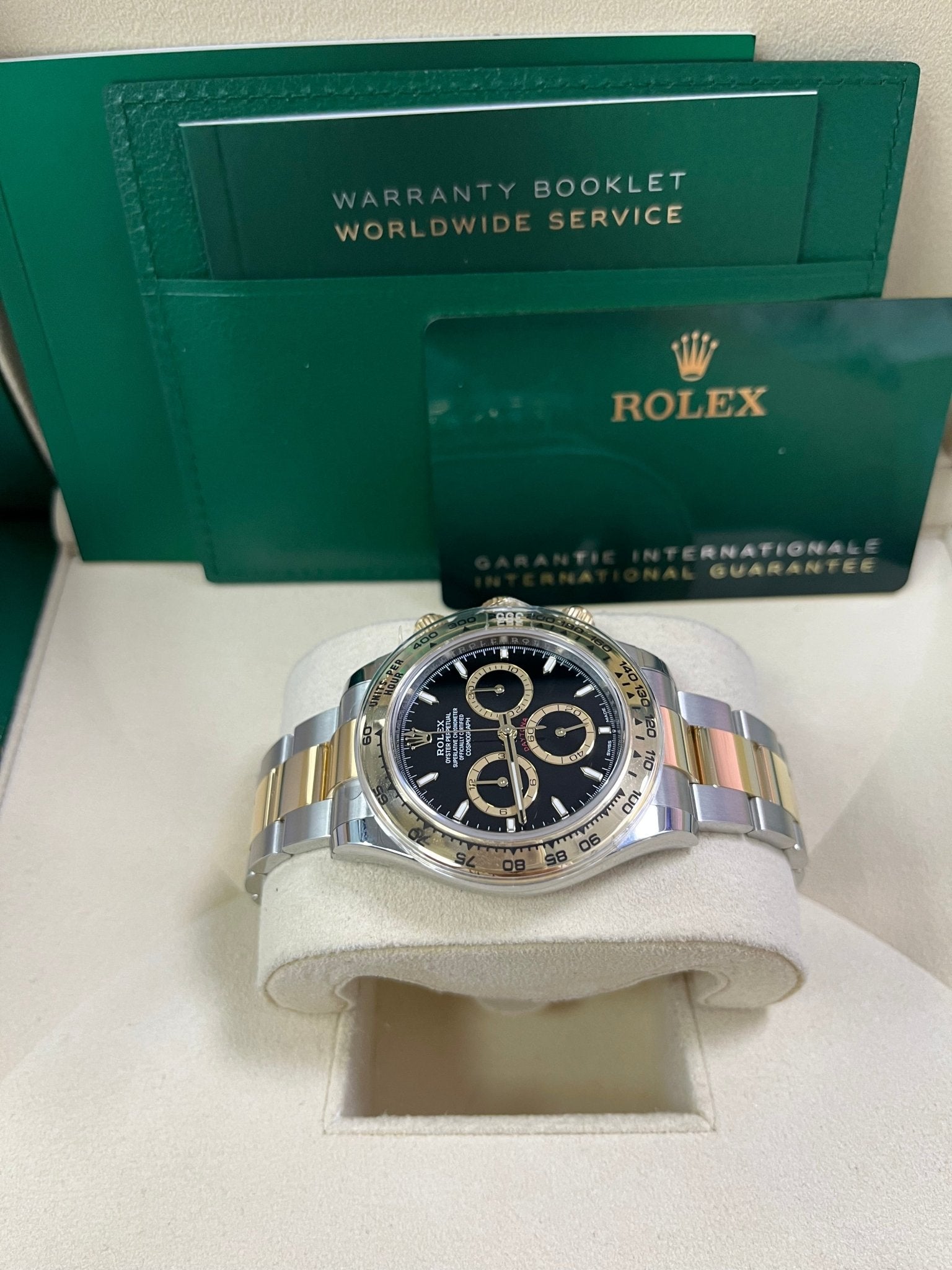 40mm yellow Rolesor case comprised of Oystersteel and yellow gold, screw-down back, screw-down crown with triplock triple waterproofness system, fixed bezel with engraved tachymetric scale in 18K yellow gold, scratch-resistant sapphire crystal scratch-resistant sapphire, black dial, index hour markers, 4131, manufacture Rolex perpetual, mechanical chronograph, self-winding movement with centre hour and minute hands, small seconds hand at 6 o’clock, chronograph via centre seconds hand, 30-minute counter at 3 o’clock and 12-hour counter at 9 o’clock, stop seconds for exact time setting, approximately 72 hours of power reserve, Oyster bracelet with three-piece solid links, folding Oysterlock safety buckle with Easylink 5mm comfort extension link. Waterproof to 100 metres / 330 feet.