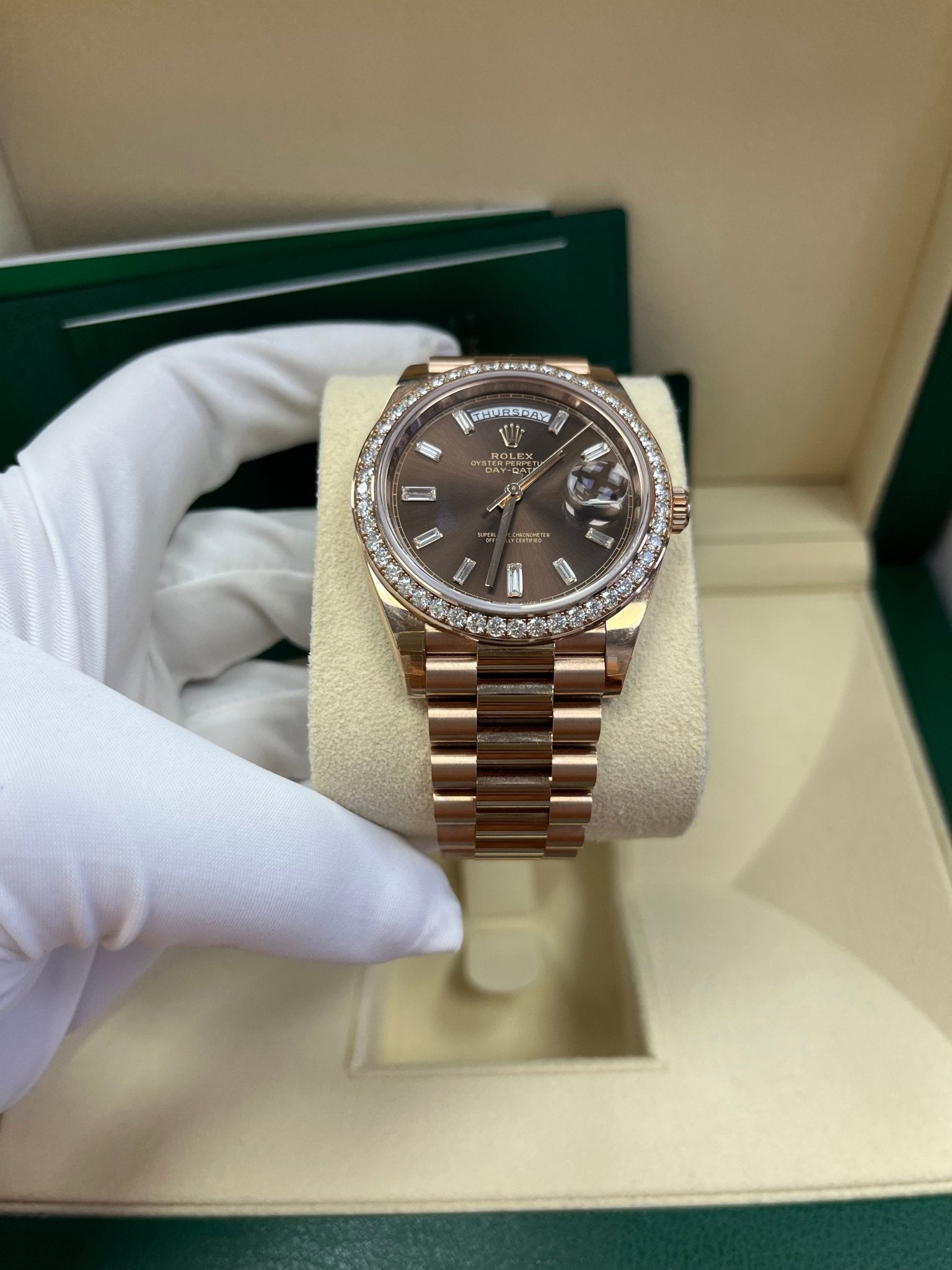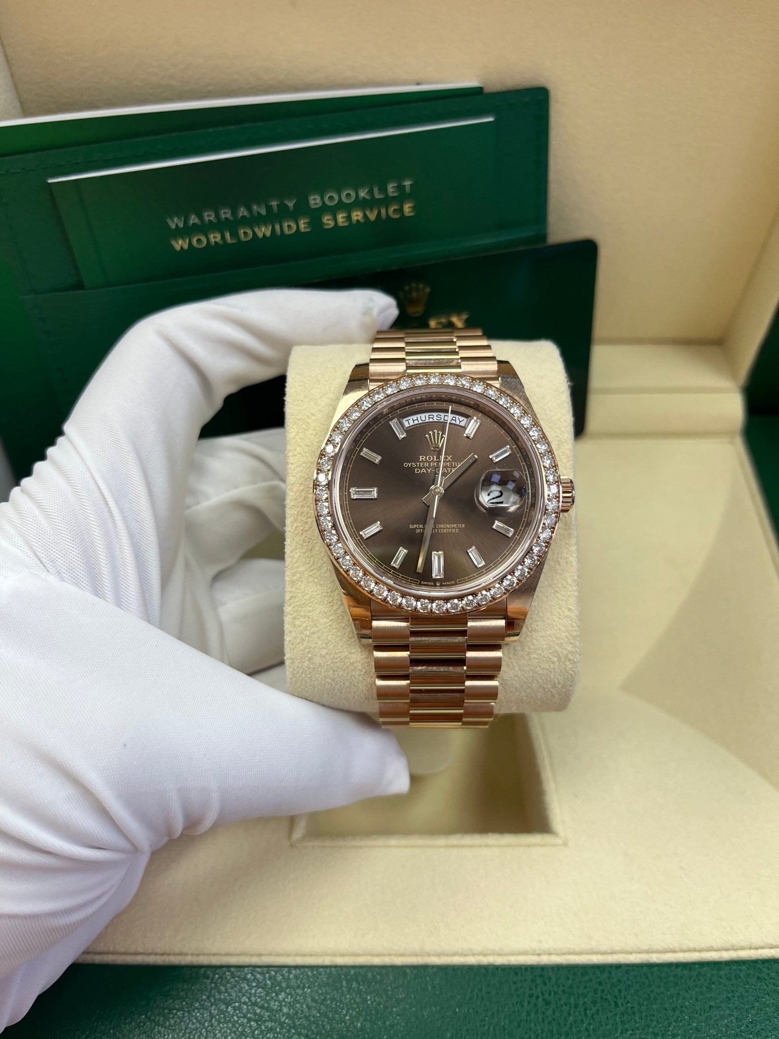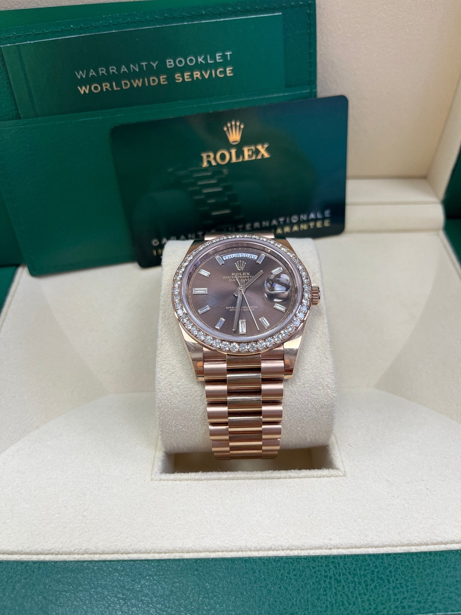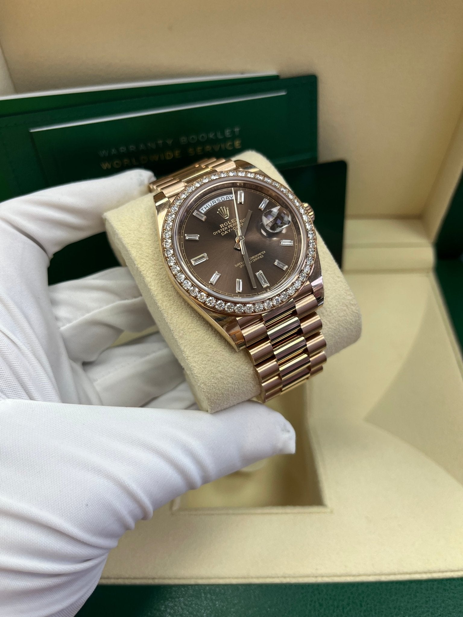 Rolex Everose Gold Day-Date 40 Watch – Everose Gold Bezel – Chocolate Baguette Diamond Dial – President Bracelet (REF#228345RBR)