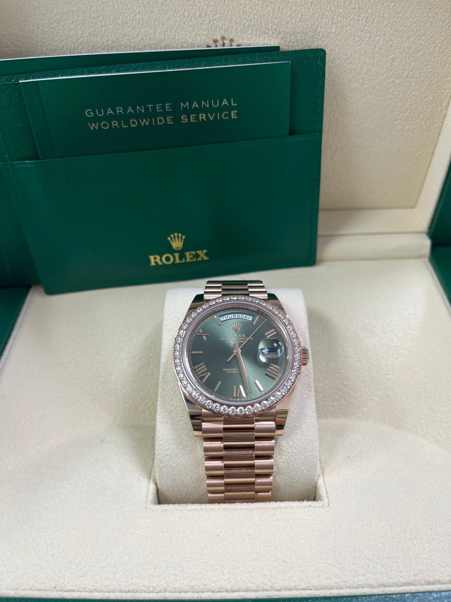 40mm 18K Everose gold case, screw-down back with Rolex fluting, screw-down crown with twin lock double waterproofness system, Everose gold bezel set with 48 diamonds, scratch-resistant double anti-reflective sapphire crystal with cyclops lens over the date, olive green dial, beveled deconstructed Roman numerals, Rolex calibre 3255 automatic movement with centre hour, minute and seconds hands, instantaneous day and date in apertures, unrestricted rapid-setting, and stop-seconds for precise time setting, approximately 70 hours of power reserve, President bracelet with three-piece solid links comprised of a polished center link, satin-finished outer links, and ceramic inserts, concealed folding Crownclasp buckle. Waterproof up to 100 meters. 2020.